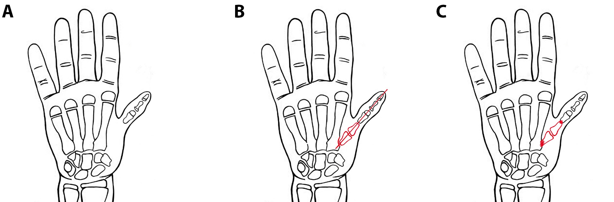 The relative length of the hypoplastic thumb compared to the index finger was measured using the method developed by Goldfarb et al.28 The norm refers to an adducted thumb, where the fingertip reaches 70% of the proximal phalanx length (AD/AB length ratio) and 32% of the index finger length (AD/AC length ratio).