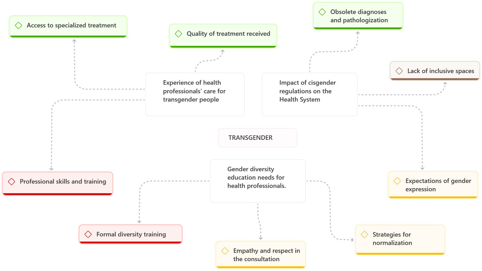 Conclusions. The transformation of the health system is urgent to ensure inclusive and equitable care for transgender people. According to the interviews, they consider that better training of professionals will improve their care. In addition, they highlight the need to reduce bureaucratic barriers, create specific protocols, and improve access to specialized treatment. Implementing inclusive public policies will contribute to a fairer and more accessible system.
