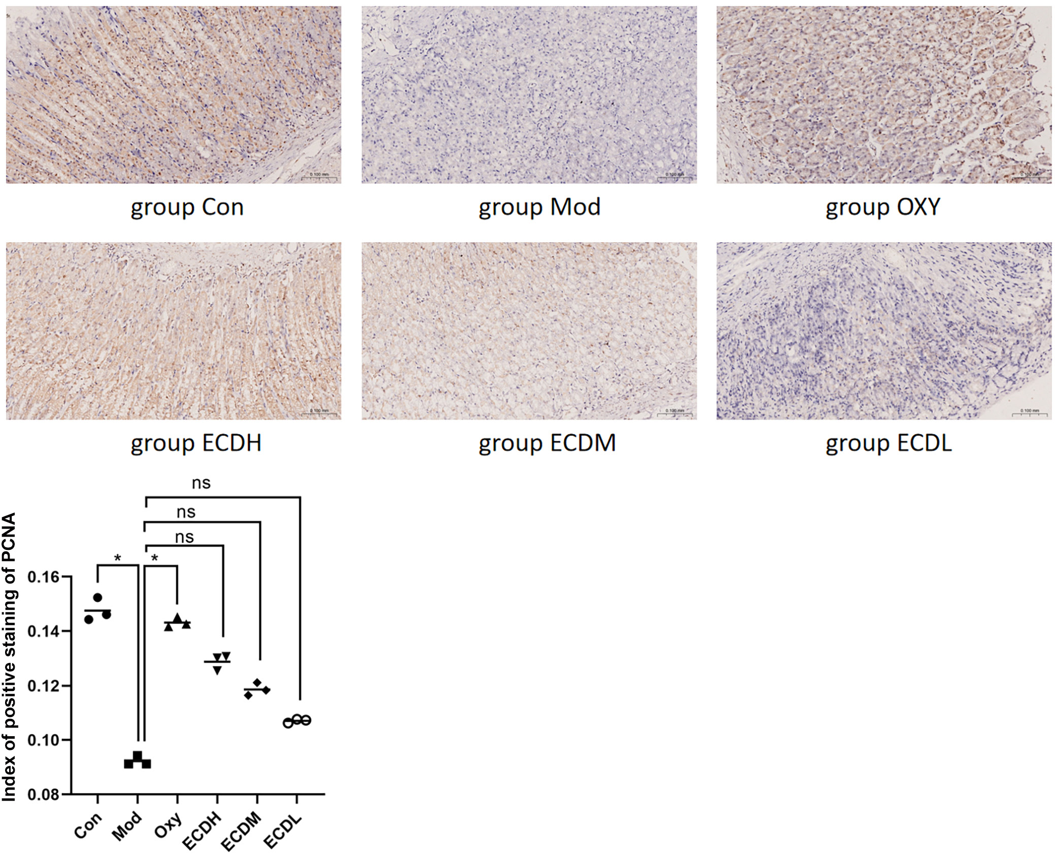 Cells in the Con group exhibited strong PCNA staining, indicating normal proliferative activity. In the Mod group, staining intensity was significantly reduced compared with the Con group (Dunn’s test: ZCon vs Mod = 14.667, adjusted pCon vs Mod = 0.005), suggesting that ethanol-induced gastric injury may suppress cell proliferation. In contrast to the Mod group, the OXY group demonstrated significantly stronger staining (Dunn’s test: ZOXY vs Mod = −12.333, adjusted pOXY vs Mod = 0.025), indicating that OXY treatment may promote the proliferation of damaged cells. Compared with the Mod group, PCNA staining in the Erchen decoction groups increased in a dose-dependent manner. The ECDH group exhibited the most intense staining and highest proliferative activity, whereas the ECDL group showed the lowest proliferative activity (Figure 3).