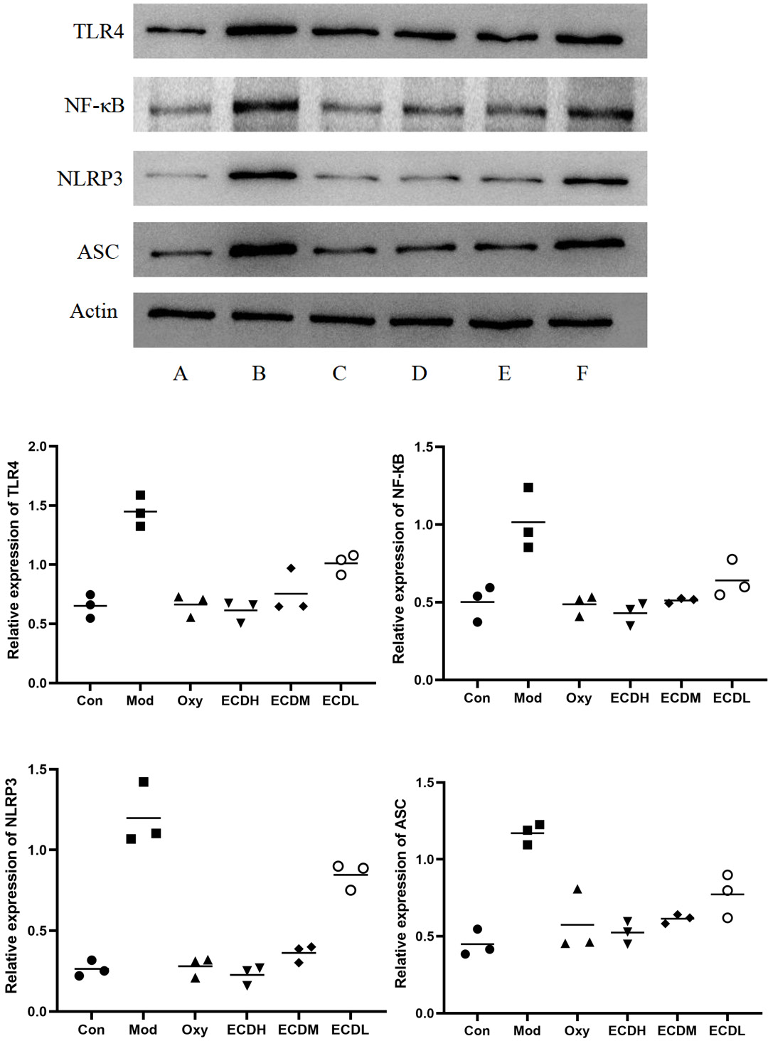 The expression levels of the inflammation- and apoptosis-related proteins TLR4, NF-κB, NLRP3, and ASC were analyzed with WB. Compared with the Con group, the Mod group exhibited higher expression levels of these proteins. In contrast, protein expression in the OXY group was reduced relative to the Mod group, indicating that OXY treatment effectively alleviated ethanol-induced inflammatory activation. Similarly, protein levels in the 3 Erchen decoction-treated groups were lower than those in the Mod group, suggesting that Erchen decoction exerts anti-inflammatory effects (Figure 5).