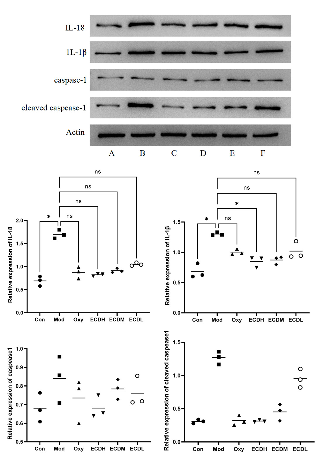 Western blot analysis demonstrated higher expression of proteins involved in inflammatory pathway activation in the Mod group compared with the Con group, including significantly elevated levels of IL-18 (Dunn’s test: ZCon vs Mod = −14.667, adjusted pCon vs Mod = 0.005) and IL-1β (Dunn’s test: ZCon vs Mod = −14.333, adjusted pCon vs Mod = 0.005). These findings suggest that ethanol exposure induced a pronounced inflammatory response. Compared with the Mod group, the OXY group exhibited reduced levels of cleaved caspase-1, IL-1β, and IL-18, indicating that OXY treatment suppressed inflammatory activation and associated cell signaling. The levels of cleaved caspase-1, IL-1β, and IL-18 were lower in the ECDH, ECDM, and ECDL groups than in the Mod group. Notably, the reduction in IL-1β levels between the ECDH and Mod groups was statistically significant (Dunn’s test: ZECDH vs Mod = 11.333, adjusted pECDH vs Mod = 0.045). Although no statistically significant differences were observed among the other Erchen decoction-treated groups, the overall trend was consistent, suggesting that Erchen decoction exerted a dose-dependent suppressive effect on inflammation, with the highest dose (ECDH) showing the most pronounced effect (Figure 6).