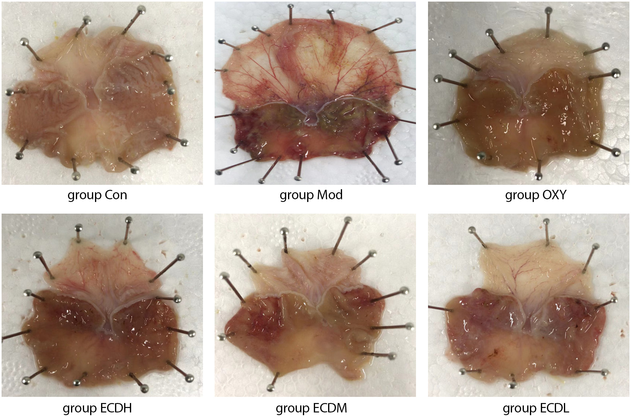 A comparison of the therapeutic effects of different doses of Erchen decoction based on macroscopic images of ethanol-induced gastric injury in rats showed that gastric tissue in the Con group exhibited no obvious lesions, with uniform coloration and intact structure. The scores for gastric epithelial erosion, ulceration, and hemorrhage were nearly 0, indicating no ethanol-induced damage. In contrast, gastric tissue in the Mod group displayed marked red hemorrhagic areas, including epithelial erosion, ulceration, and focal bleeding lesions. The Mod group had significantly higher aggregate scores than the Con group (Dunn’s test: ZMod vs Con = −13.667, adjusted pMod vs Con = 0.010), indicating severe damage induced by 50% ethanol. In the OXY group, gastric tissue damage was mild, hemorrhage was reduced, and the aggregate gastric injury score was lower than that in the Mod group, suggesting that OXY treatment may attenuate ethanol-induced injury. The severity of gastric tissue damage varied among the Erchen decoction dosage groups, with the ECDH group exhibiting the mildest damage, followed by the ECDM group. Compared with the ECDH and ECDM groups, the ECDL group exhibited more severe damage; however, relative to the Mod group, the ECDL group showed improvement, with lower scores for gastric mucosal and epithelial injury. These results indicate that Erchen decoction protects against ethanol-induced gastric injury in a dose-dependent manner (Figure 1, Table 2).