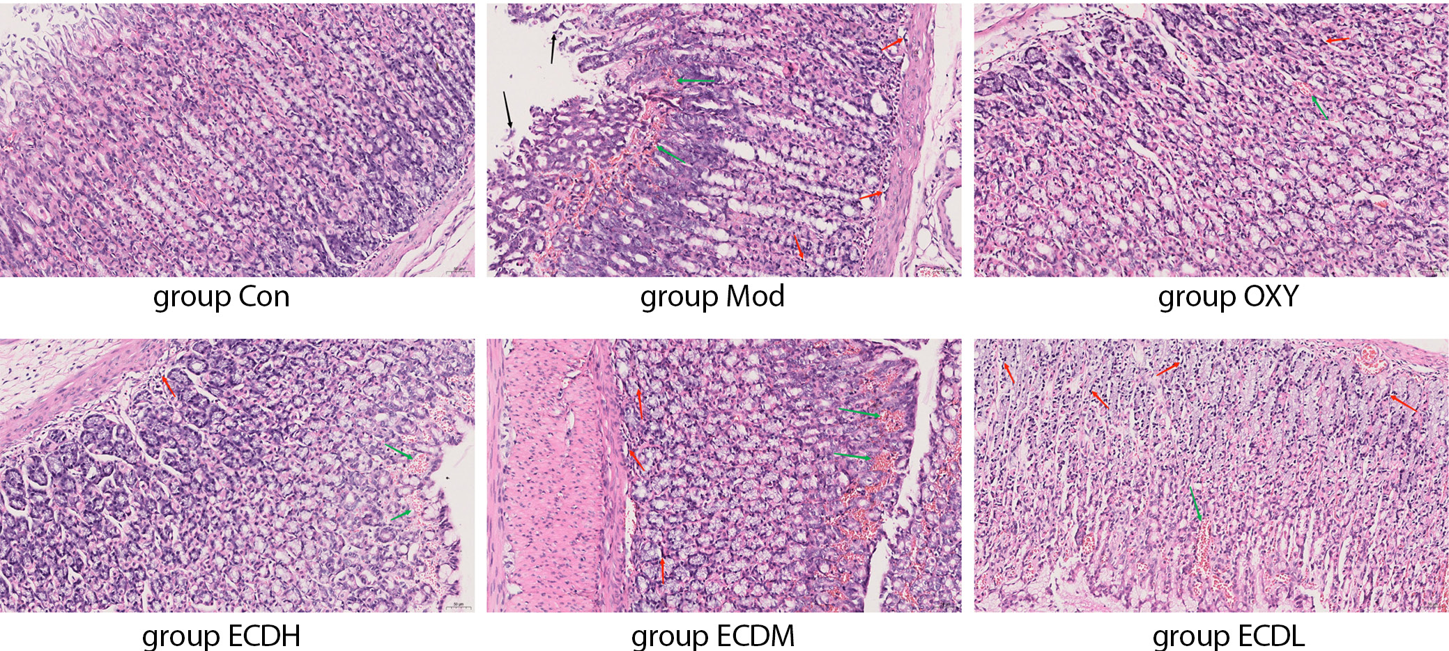 The Mod group exhibited an abnormal overall gastric architecture, with a significantly higher aggregate score than the Con group (Dunn’s test: ZMod vs Con = −14.667, adjusted pMod vs Con = 0.005). Compared with the Mod group, both the OXY and ECDH groups showed improvement in ethanol-induced gastric injury. The general organization of the gastric tissue was largely preserved, with a slightly irregular mucosal layer, relatively well-organized glands, mild mucosal epithelial swelling and hyperplasia with congestion, and limited inflammatory cell infiltration in the submucosa. A reduction in the dose of Erchen decoction was associated with a gradual decrease in therapeutic efficacy against ethanol-induced gastric injury.