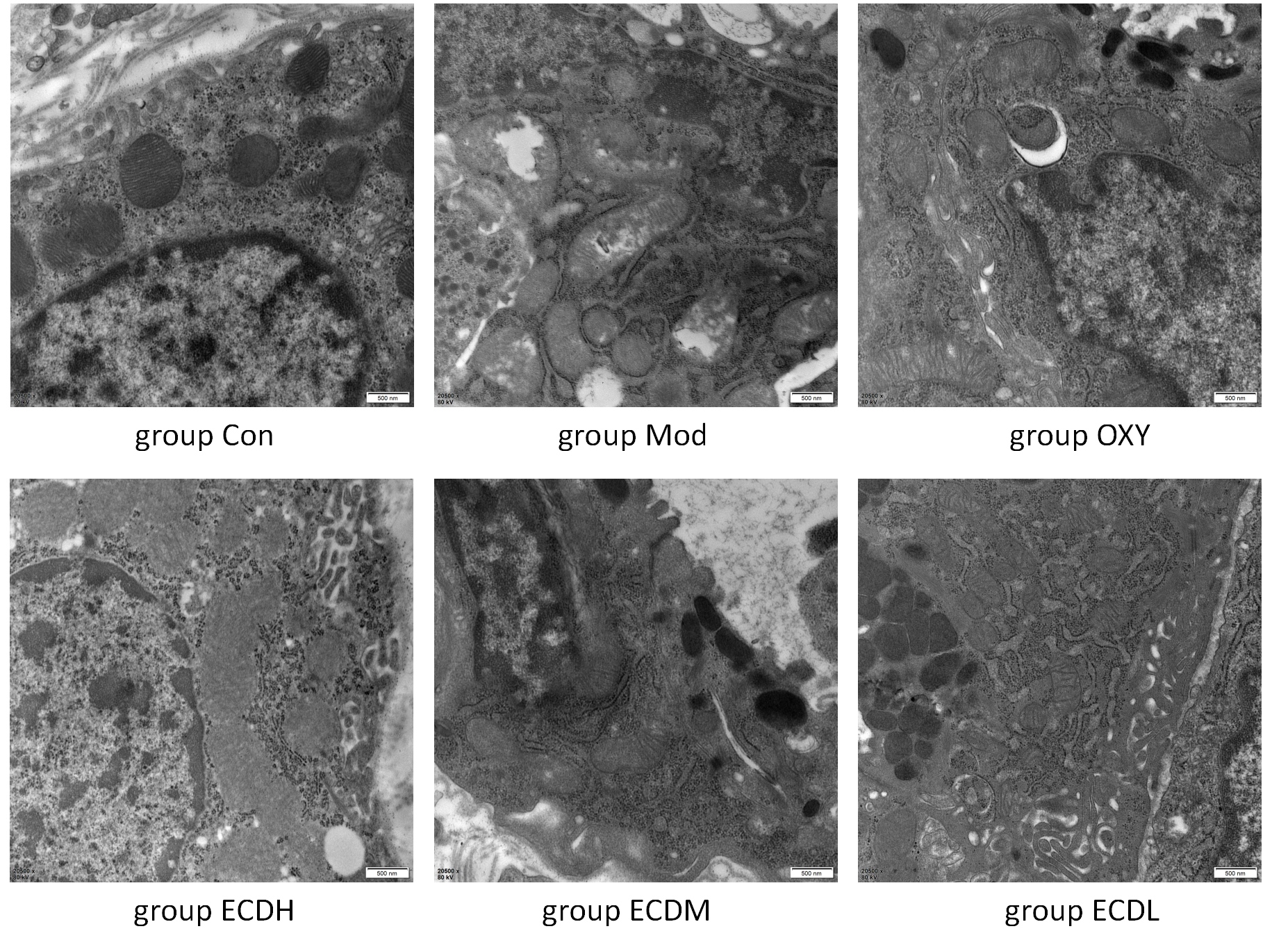 The Con group exhibited normal gastric ultrastructure, including well-defined mitochondria and intact cell membranes. Compared with the Con group, the Mod group showed marked mitochondrial swelling and cell membrane damage, indicating inflammation and cellular injury. The OXY and Erchen decoction groups demonstrated attenuation of these pathological changes, particularly in the ECDH group, where cellular architecture was substantially improved compared with the Mod group. Although the ECDM and ECDL groups showed partial structural improvement, these effects were less pronounced than those observed in the ECDH group (Figure 4).