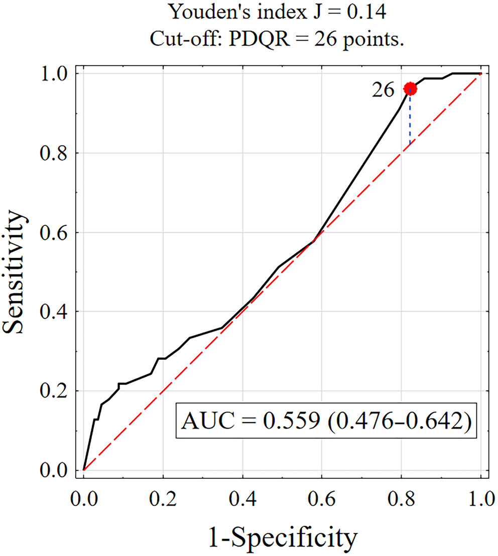 Receiver operating characteristic curve analysis was used to determine the cutoff value for communication satisfaction (Figure 1). For CAT scores ≥3.25, test sensitivity was 62.8%, specificity was 68.8%, and the AUC was 0.664. The lower limit of the 95% confidence interval (95% CI) for the AUC was 0.583, exceeding the acceptable threshold of 0.5, which indicates that a communication satisfaction–based test may be useful in classifying patients as adherent or non-adherent to therapeutic recommendations.