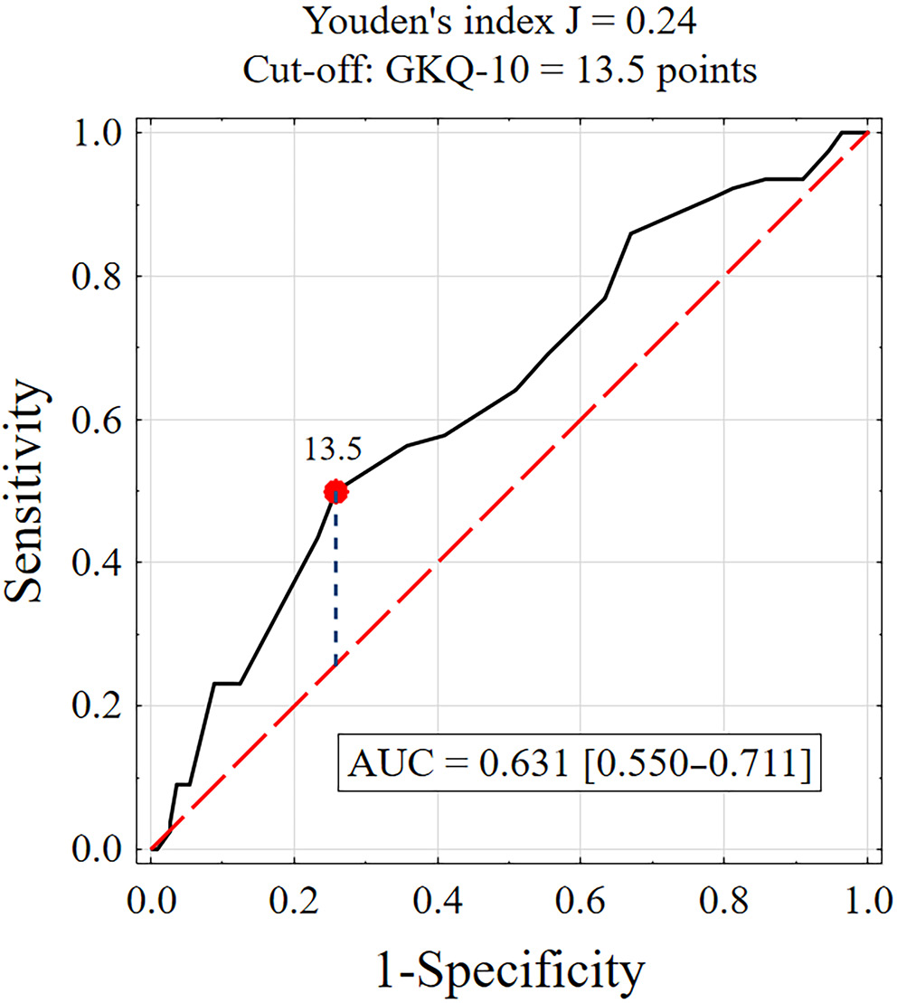 Receiver operating characteristic curve analysis was used to establish the cutoff value for glaucoma knowledge (Figure 4). For GKQ-10 scores ≥ 13.5, test sensitivity was 48.7% and specificity was 75.0%, with an AUC of 0.631. The lower limit of the 95% CI for the AUC was 0.550, which exceeded the acceptable threshold of 0.5, indicating that a glaucoma knowledge–based test may be useful in classifying patients as adherent or non-adherent to therapeutic recommendations.
