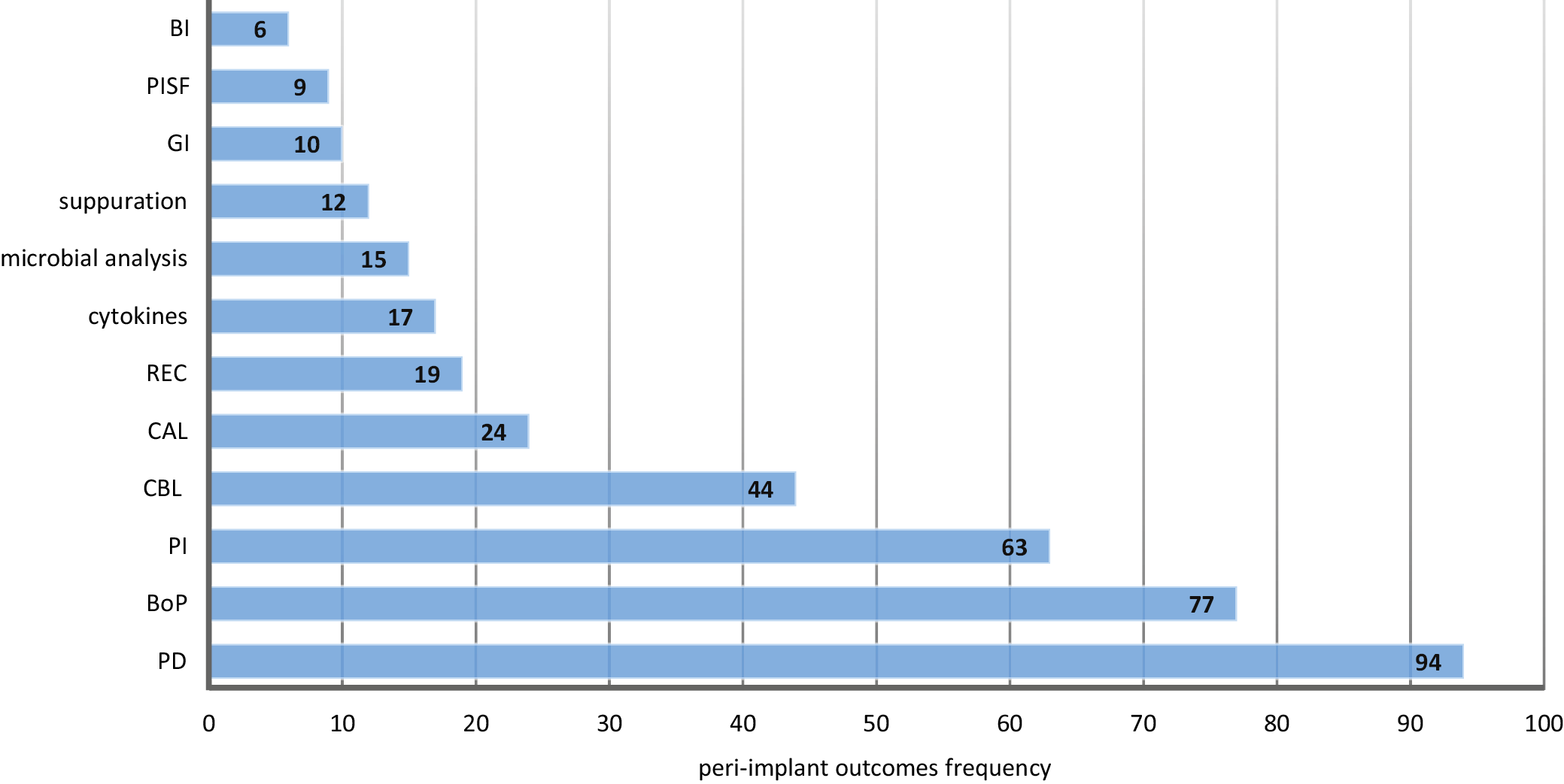 The frequency of the outcomes variables analyzed in the selected studies are presented in the Figure 2. The most frequently reported variables were PD, which appeared 94 times,19, 20, 23, 24, 26, 27, 28, 29, 30, 31, 32, 33, 34, 35, 36, 37, 38, 39, 40, 41, 42, 43, 44, 45, 46, 47, 48, 49, 51, 52, 53, 54, 55, 56, 57, 58, 59, 60, 61, 62, 63, 64, 65, 66, 67, 68, 69, 70, 71, 72, 73, 74, 75, 76, 77, 78, 79, 80, 81, 82, 83, 84, 85, 86, 87, 88, 89, 90, 91, 92, 93, 94, 95, 96, 97, 98, 99, 100, 101, 102, 103, 104, 105, 106, 107, 108, 110, 111, 112, 113, 114, 115, 116, 117, 118 and BoP, mentioned 77 times.19, 20, 23, 24, 26, 27, 29, 30, 31, 32, 33, 34, 35, 36, 37, 38, 39, 40, 41, 43, 44, 45, 46, 47, 48, 49, 51, 55, 56, 57, 61, 62, 63, 64, 65, 66, 67, 68, 70, 71, 73, 74, 75, 76, 77, 78, 79, 80, 81, 82, 83, 85, 86, 87, 88, 89, 90, 91, 92, 93, 94, 95, 97,