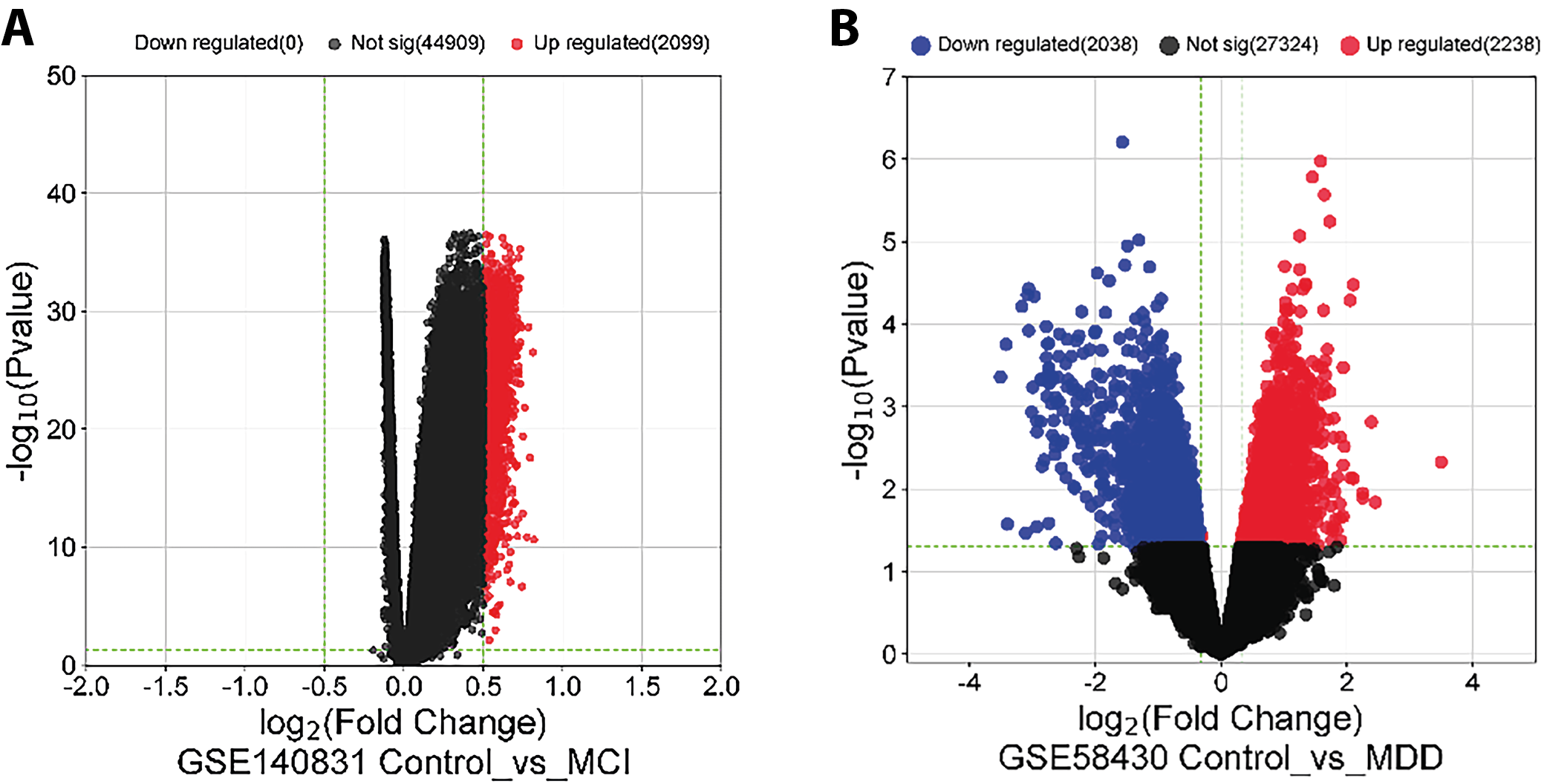 Microarray gene expression data were obtained from the Gene Expression Omnibus (GEO) database (https://www.ncbi.nlm.nih.gov/geo/). Two transcriptomic datasets, GSE58430 and GSE140831, were selected. GSE58430 contains gene expression data from 12 patient samples (6 MDD and 6 healthy controls), while GSE140831 includes 664 samples (134 MCI and 530 healthy controls).