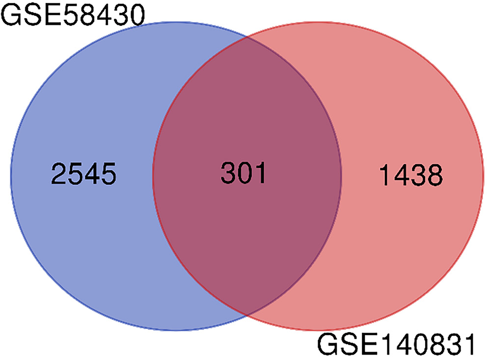 A total of 3,122 genes were identified as depression-related DEGs in the GSE58430 dataset, of which 1,537 were downregulated and 1,585 were upregulated, as shown in the volcano plot (Figure 1A). In the GSE140831 dataset, 1,739 MCI-related DEGs were identified, all of which were upregulated (Figure 1B). The 301 genes shared between MDD- and MCI-related DEGs are shown in the Venn diagram (Figure 2).