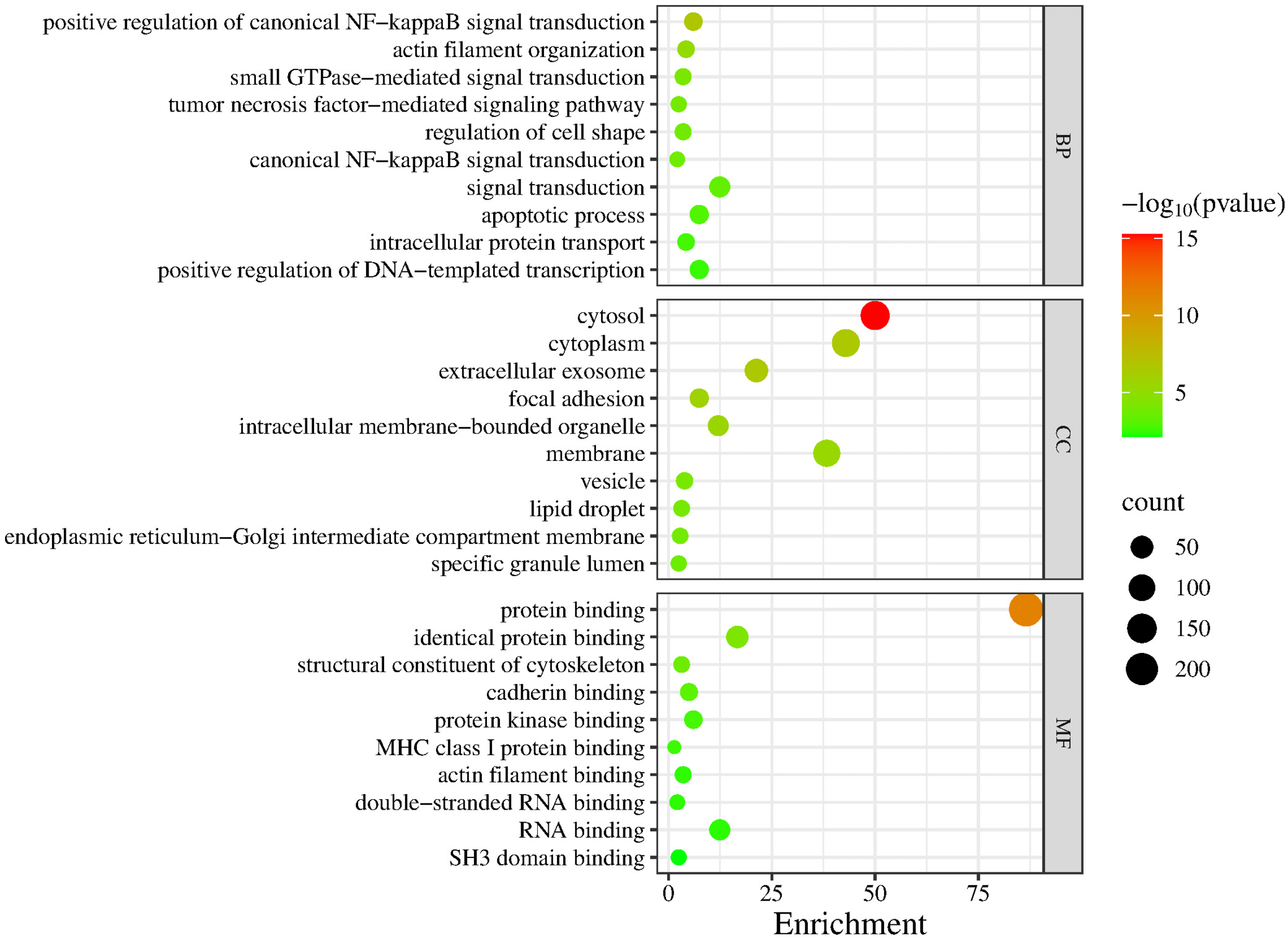 The GO terms were categorized into 3 domains: biological processes (BP), molecular functions (MF) and cellular components (CC). In the BP domain, significantly enriched GO terms among DEGs shared between MDD and MCI included positive regulation of canonical NF-κB signaling, actin filament organization, small GTPase-mediated signal transduction, tumor necrosis factor (TNF)-mediated signaling pathway, and regulation of cell shape. In the CC domain, significantly enriched GO terms included cytosol, cytoplasm and extracellular exosome. In the MF domain, protein binding, identical protein binding, and structural constituent of the cytoskeleton were enriched. Figure 3 shows a comprehensive set of significantly enriched GO terms in bubble plots. The KEGG enrichment analysis identified several pathways that may play important roles in infection and apoptosis. Figure 4 shows these pathways, including Salmonella infection, pathogenic Escherichia coli infection, human immunodeficiency virus 1 (HIV-1) infection, shigellosis, human cytomegalovirus infection, and apoptosis.
