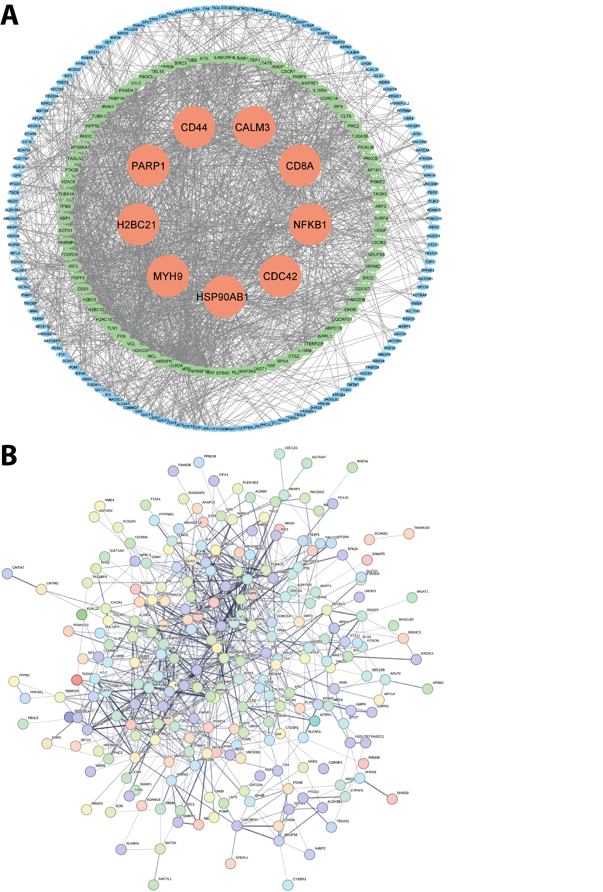 To further explore the interactions among DEGs shared between MDD and MCI, we performed a PPI network analysis, constructed with the STRING database (Figure 5A) and visualized in Cytoscape (Figure 5B). The network revealed 127 nodes with a degree greater than 10. Among the nine core genes identified as having the highest degree in the PPI network – HSP90AB1, CDC42, NFKB1, CD8A, CALM3, PARP1, CD44, H2BC21, and MYH9 – several are notable for their well-established roles in neuropsychiatric and neurodegenerative conditions. Their centrality in the network and functional relevance suggest they may serve as candidate targets for early intervention or therapeutic development in the comorbidity of MDD and MCI.