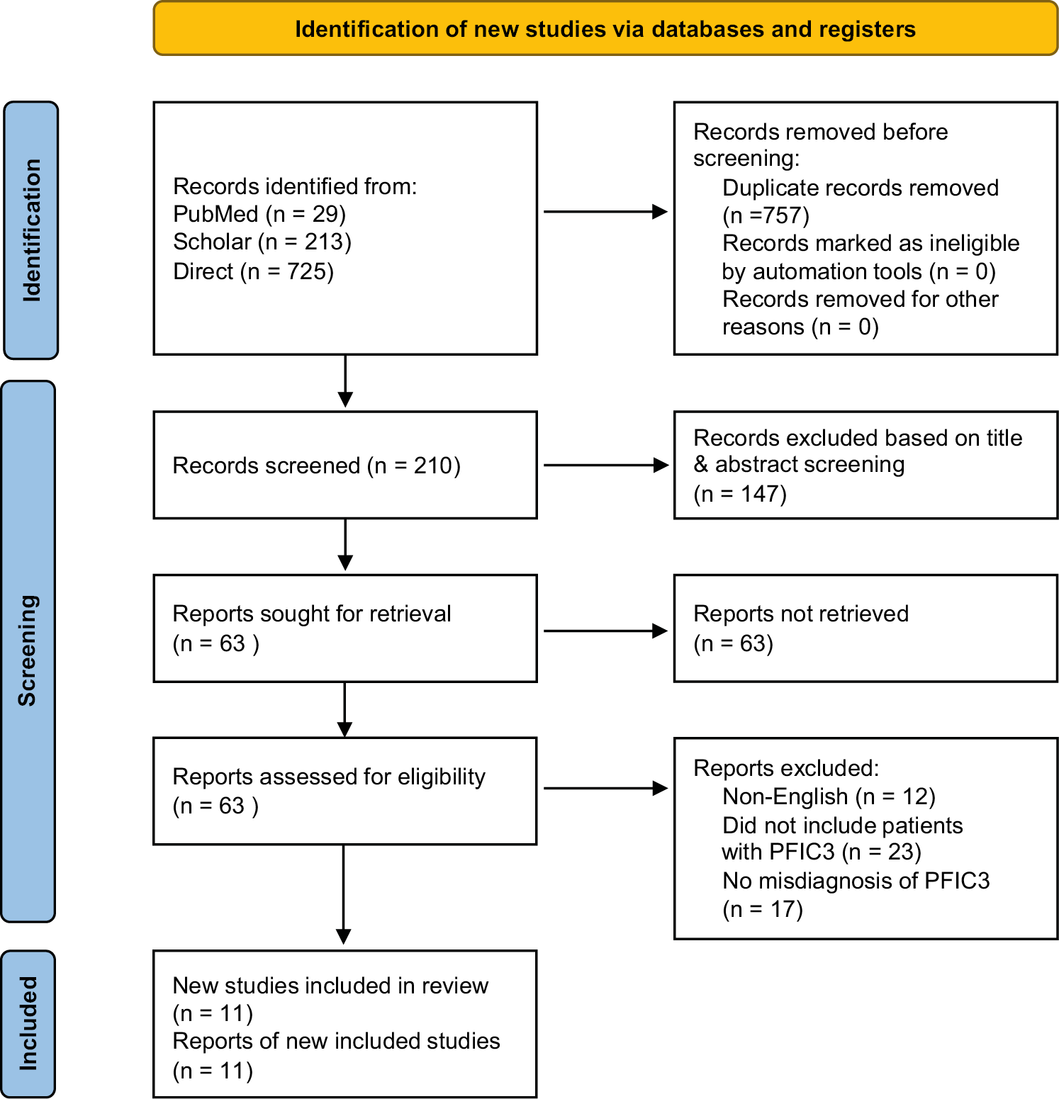 A comprehensive search across the databases yielded 967 references. After identifying and removing 757 duplicates, 210 references remained for relevance assessment. Of these, 147 abstracts were excluded due to irrelevance to the study. Subsequently, 63 articles were retrieved and evaluated against the eligibility criteria for inclusion in the review. Ultimately, 11 studies were included, having met the inclusion criteria. The remaining articles were excluded based on the following criteria: 12 were not published in English, 23 did not involve patients with PFIC3 and 17 did not address a misdiagnosis of PFIC3 as WD. Figure 1 presents the PRISMA diagram, which summarizes the search strategy.