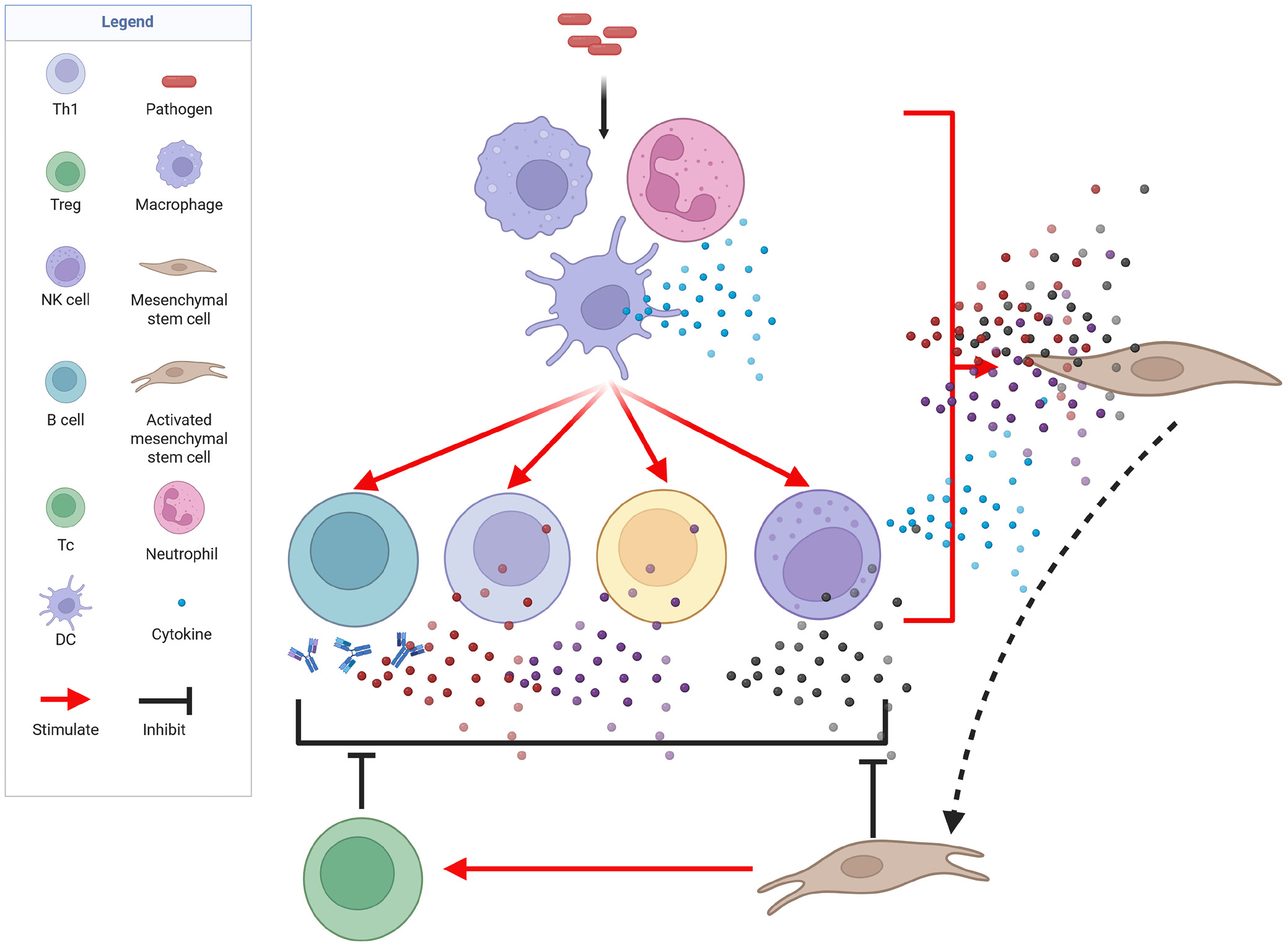 The ubiquity of MSCs across virtually all organs likely reflects the critical importance of the tissue-level safeguard provided by these cells. Even in organs in which MSCs have not been conclusively identified, it is plausible that cells of analogous ontogeny persist in a dormant state or have differentiated into tissue-adapted subsets. Under homeostatic conditions, MSCs remain quiescent and help maintain local tissue equilibrium. When injury occurs, pro-inflammatory cytokines released by infiltrating immune cells activate MSCs, inducing a potent anti-inflammatory and immunomodulatory phenotype. Thus, MSCs provide a secondary defense mechanism within tissues. In contrast to Tregs, which primarily function to suppress inflammation, MSCs are multifunctional: they simultaneously temper immune activity and orchestrate tissue repair through a repertoire of paracrine and direct cell–cell mechanisms. Therefore, we propose that MSCs be regarded as a specialized, tissue-resident extension of the immune system – a gatekeeper population that shields host tissues from collateral damage inflicted by excessive immune activation.
