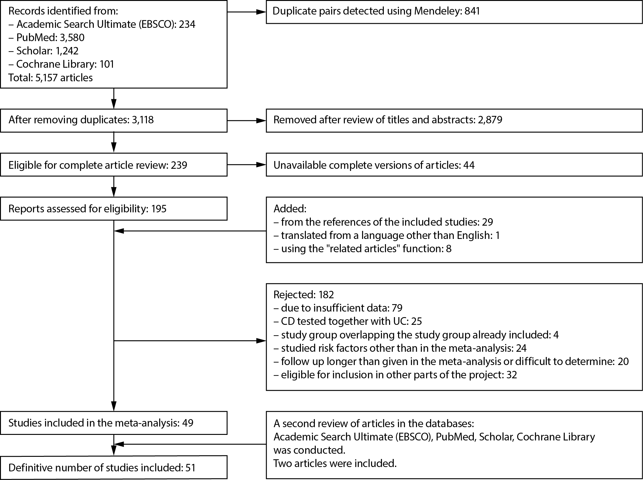 The first author (J.Ł.) conducted a systematic literature search using the PubMed, Cochrane Library, Academic Search Ultimate (EBSCO), and Google Scholar databases between November 21 and December 4, 2021. The search included the following terms: “Crohn’s disease,” “Crohn’s disorder,” “IBD,” “regional enteritis,” combined with “complications,” “outcomes,” “morbidity,” “recurrence,” “relapse,” “remission,” “treatment outcome,” “treatment failure,” and “reoperation,” as well as “postoperative,” “perioperative,” “risk factors,” “contributing factors,” “predisposing factors,” “surgery,” and “resection”. Different combinations of these terms were used with the logical operators “AND” and “OR”. The search included articles published up to December 4, 2021. The authors did not contact researchers to obtain unpublished studies. On July 15, 2025, the databases were re-examined after a 3.5-year interval using the same search strategy to update the literature review. Articles published in all languages were considered. To broaden the search results, the “related articles” function in PubMed and the reference lists of the included studies were also screened.