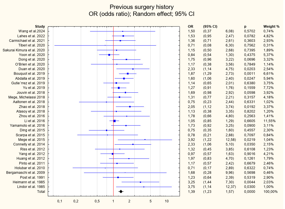 Following the initial analysis, an additional analysis of risk factors associated with severe postoperative complications (defined as Clavien–Dindo grade ≥IIIa) was performed. However, the available data were sufficient to analyze only prior surgical interventions, which did not show a statistically significant association (OR = 1.55; 95% CI: 0.82–2.96; p = 0.181).
