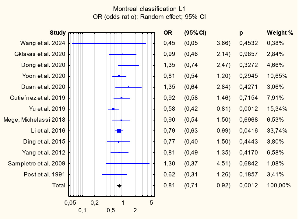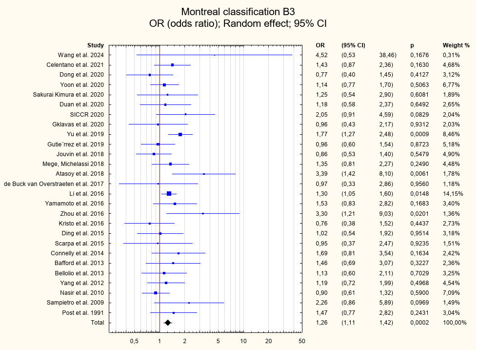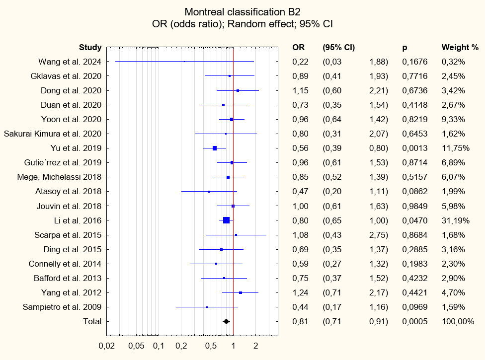 Additionally, the presence of Montreal classification group B3 (penetrating disease with fistula formation) was identified as a statistically significant risk factor for postoperative complications (level I evidence; OR = 1.26; 95% CI: 1.11–1.42; p < 0.001). Montreal classification group L2 was also identified as a significant risk factor for postoperative complications in this cohort (OR = 1.38; 95% CI: 1.11–1.72; p = 0.004). However, there is no clear consensus regarding the Montreal classification as a prognostic indicator of disease progression. A study by Tajra et al.74 found no association between disease progression as defined by the Montreal classification and the risk of postoperative complications. Conversely, Lin et al.75 suggested that categorizing patients based on colonic involvement may provide a more reliable predictor of clinical outcomes than the Montreal classification. This issue warrants further investigation, particularly in light of reports suggesting that the Montreal classification may be associated with a statistically significant increase in the need for emergency surgical interventions.74