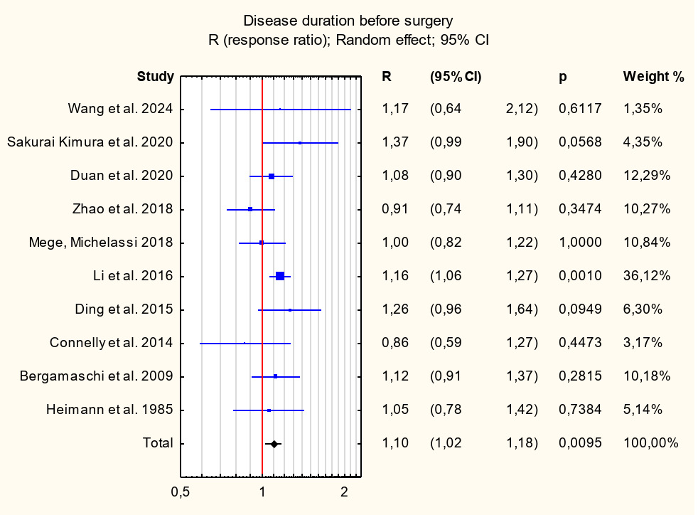 Materials and methods. A meta-analysis was conducted based on studies examining early surgical and medical complications following abdominal surgery for CD. The analyzed risk factors included disease duration prior to surgery, history of previous surgeries, presence of concurrent perianal disease, intra-abdominal abscess during surgery, and Montreal classification subtypes A1–3, L1–4, and B1–3. A systematic review was performed using 4 major databases: PubMed, Cochrane Library, Academic Search Ultimate (EBSCO), and Google Scholar. Outcomes were assessed using the odds ratio (OR) and response ratio (R), together with 95% confidence intervals (95% CIs). Egger’s test was used to evaluate publication bias. Heterogeneity was assessed using the I2 statistic, with I2 > 50% indicating significant variability.
