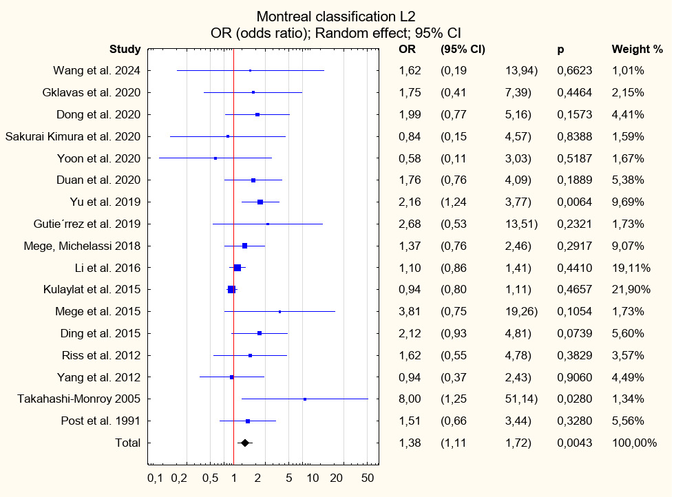 Results. A total of 51 articles met the inclusion criteria. The analysis identified several significant risk-increasing factors: history of previous surgeries (OR = 1.39; 95% CI: 1.23–1.57), Montreal classification group B3 (OR = 1.26; 95% CI: 1.11–1.42), disease duration before surgery (R = 1.10; 95% CI: 1.02–1.18), and group L2 (OR = 1.38; 95% CI: 1.11–1.72). Conversely, factors associated with a reduced risk of postoperative complications included group L1 (OR = 0.81; 95% CI: 0.71–0.92) and group B2 (OR = 0.81; 95% CI: 0.71–0.91).