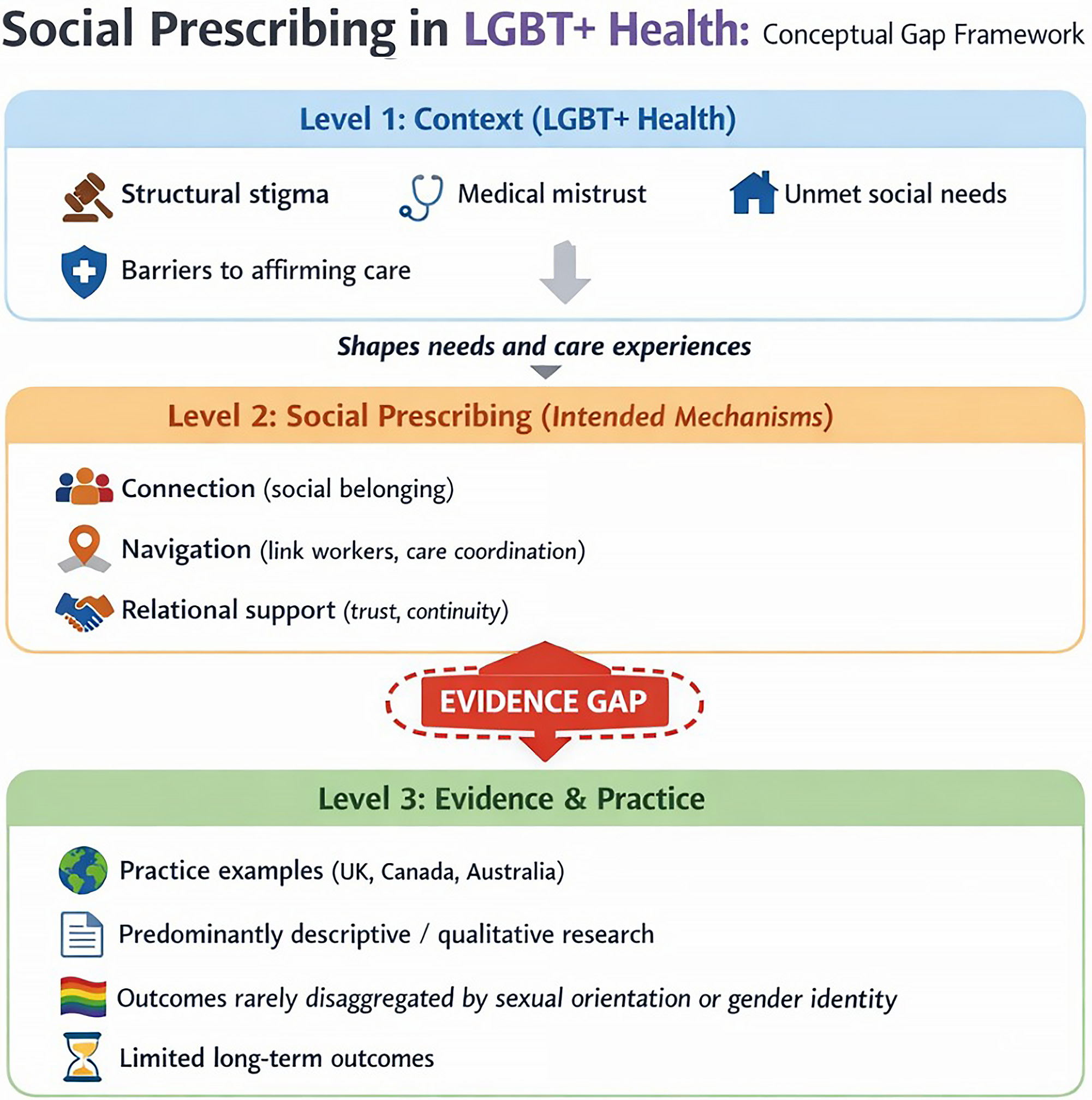 Existing SP evaluations frequently target broader categories of vulnerability (e.g., social isolation, multimorbidity, socioeconomic disadvantage), within which LGBT+ individuals may be implicitly included but are rarely analyzed as a distinct group. Descriptive accounts from primary care initiatives demonstrate that link worker models can engage people with complex social needs, including those related to stigma and discrimination. However, the available evidence does not allow assessment of how such models perform specifically for sexual and gender minority patients. Observational studies of general SP outcomes (e.g., self-reported wellbeing, healthcare utilization) do not typically report subgroup analyses by sexual orientation or gender identity, leaving a marked gap in understanding how LGBT+ status intersects with SP pathways.