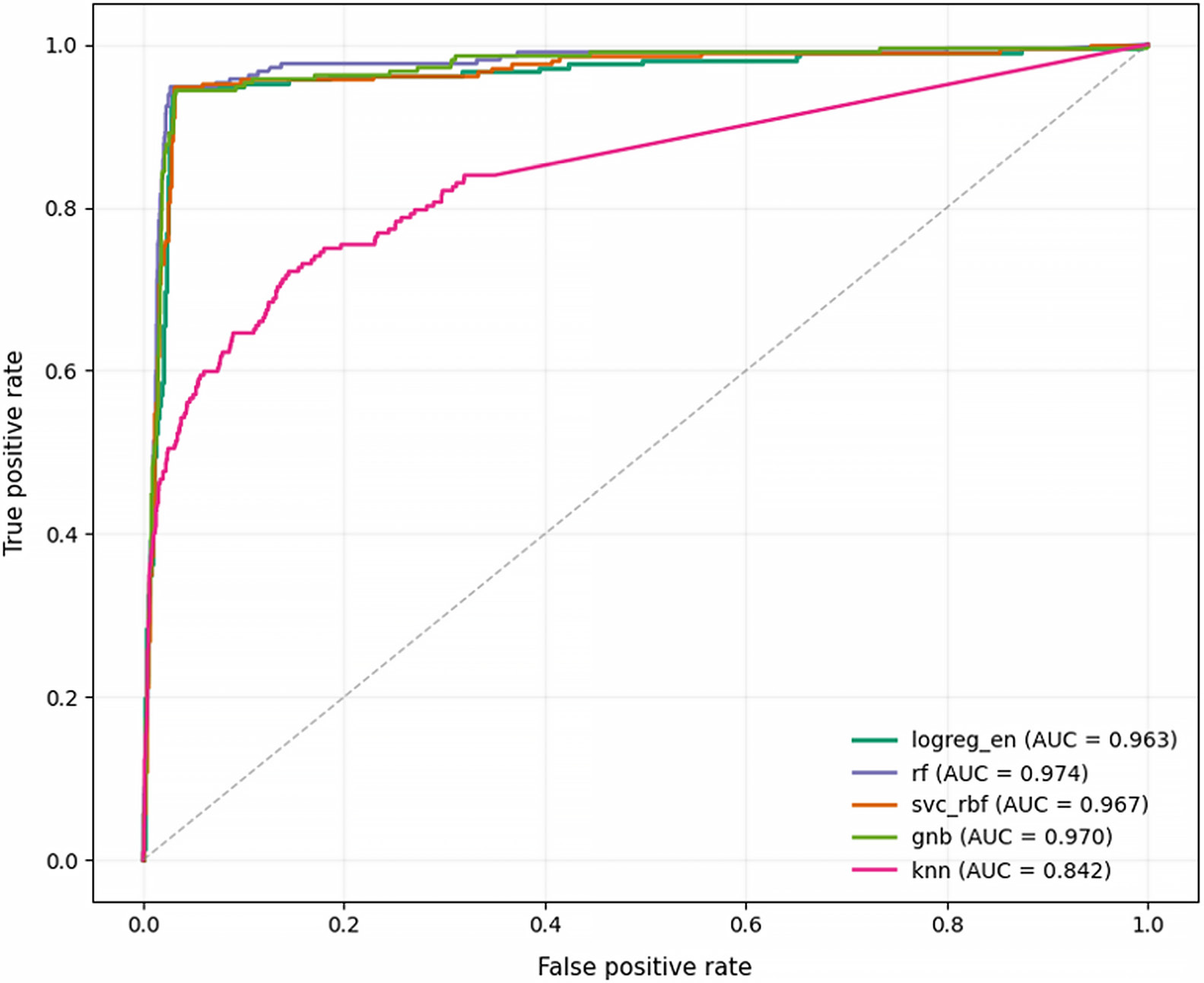 Across fivefold cross-validation, substantial discriminatory performance was observed for several evaluated models (Table 2). Penalized logistic regression with elastic net regularization (logreg_en) demonstrated consistently high discrimination, with fold-specific ROC-AUC values ranging from 0.95 to 0.99. Measures of overall probabilistic accuracy were favorable, as reflected by low log loss and Brier scores. The number of features retained in the final model was stable across folds (n = 21), suggesting robustness of the selected predictor set. The SVC-RBF achieved similarly high ROC-AUC values (approx. 0.96–0.98) and competitive PR-AUC values. However, compared with logistic regression, the SVC-RBF model exhibited less favorable calibration metrics (higher log loss and Brier score) and greater variability in optimal decision thresholds across folds, indicating reduced stability of probability estimates.