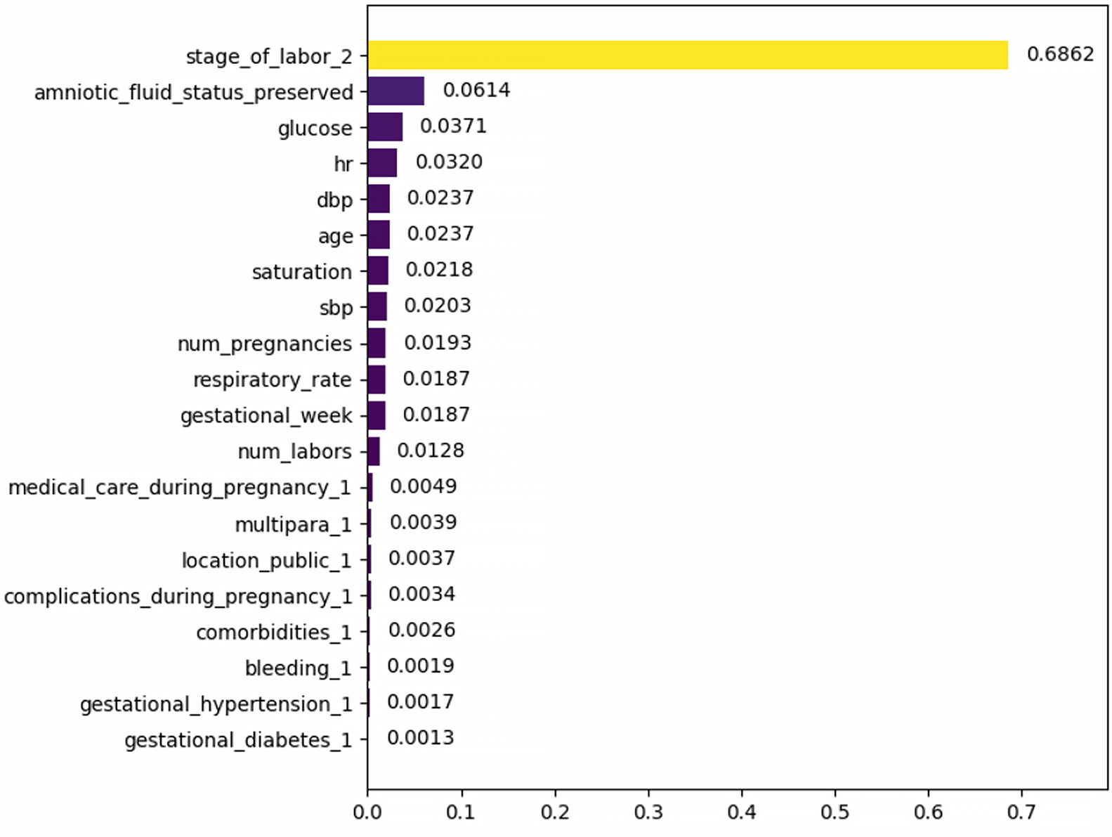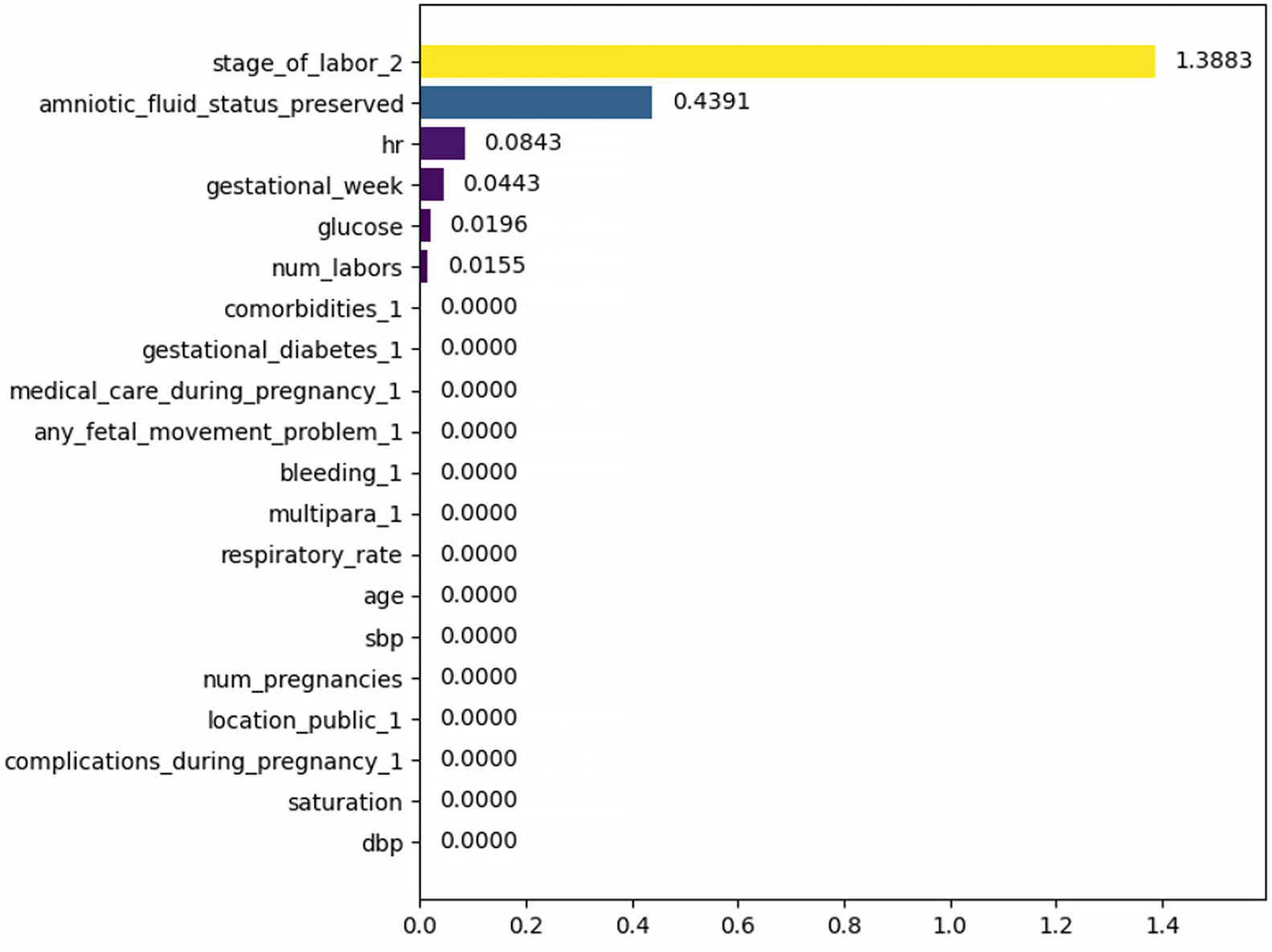 In the RF model, SHAP contributions showed a similar hierarchy, with the largest absolute attribution again observed for stage_of_labor_2 (mean |SHAP| ≈ 0.098) and amniotic_fluid_status_1 (mean |SHAP| ≈ 0.027), while the remaining predictors contributed smaller incremental information. Overall, SHAP results provided a decomposition of the fitted model output that was fully consistent with the imposed regularization structure and the primary feature-importance findings, and were interpreted descriptively as explanations of model predictions rather than as causal effects (Table 4).