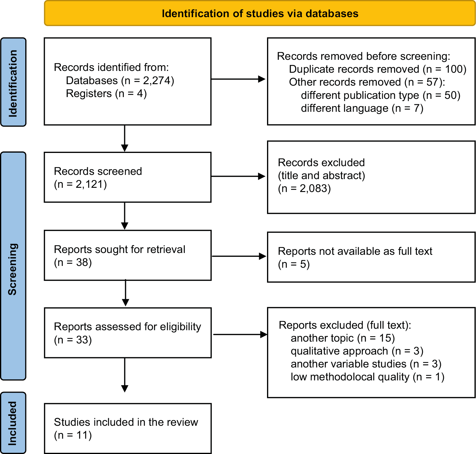 Finally, 15 records were excluded for addressing a different topic; 3 for using a qualitative approach exclusively; 3 for measuring outcomes other than ageism (e.g., caring competence or empathy); and 1 study was excluded due to low methodological quality, specifically due to the use of non-validated ad hoc questionnaires and the absence of a control group and follow-up assessment. Finally, 11 studies met the eligibility criteria following full-text review. The study selection process is illustrated in the PRISMA flow diagram (Figure 1).