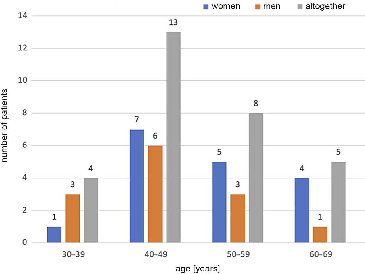 The 30 patients included in this study (16 women and 14 men) were operated on using the two-level ACDF method. The distribution of patient age is presented in Figure 1. Three patients (2 men and 1 woman) who did not report for follow-up examination were excluded from the postoperative evaluation.