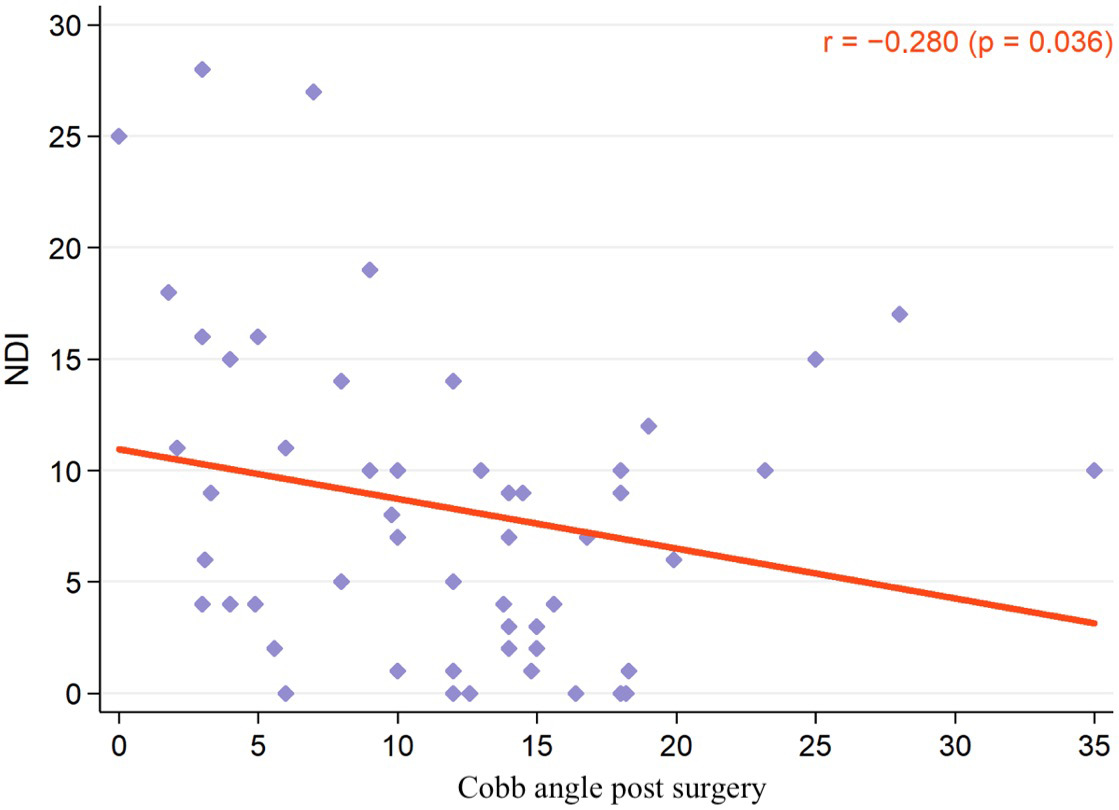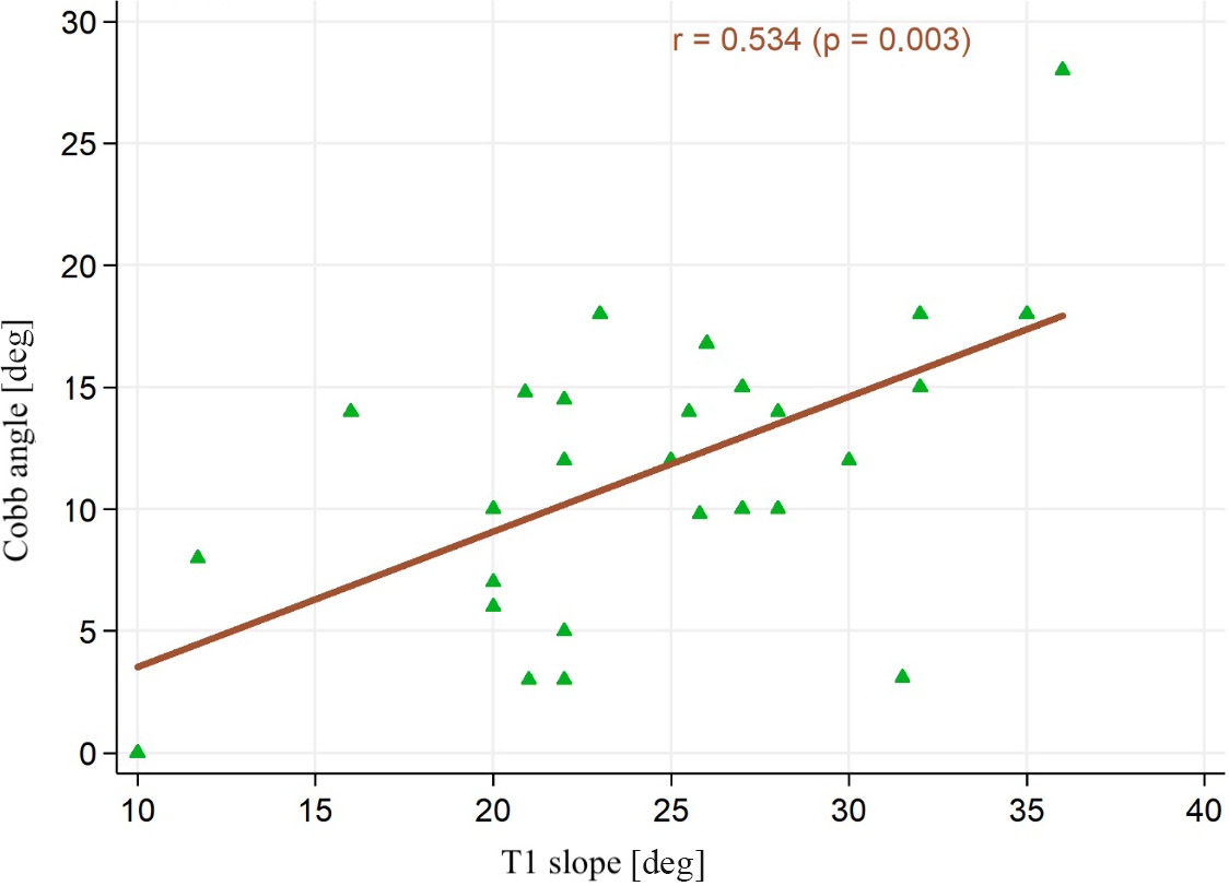 Results. The cervical lordosis angle significantly changed (p < 0.01) to an average of 11.52°. The SVA C2–C7 distance significantly decreased (p < 0.001) to an average of 21.06 mm. The value of the T1 slope angle did not change significantly before and after surgery (p = 0.706). After surgery, statistically significant improvement was achieved on the NDI scale for neck pain (p < 0.001) to an average of 9. The NDI score significantly decreased over time (p < 0.001), and this change was significantly related to the increased Cobb angle (p = 0.036).