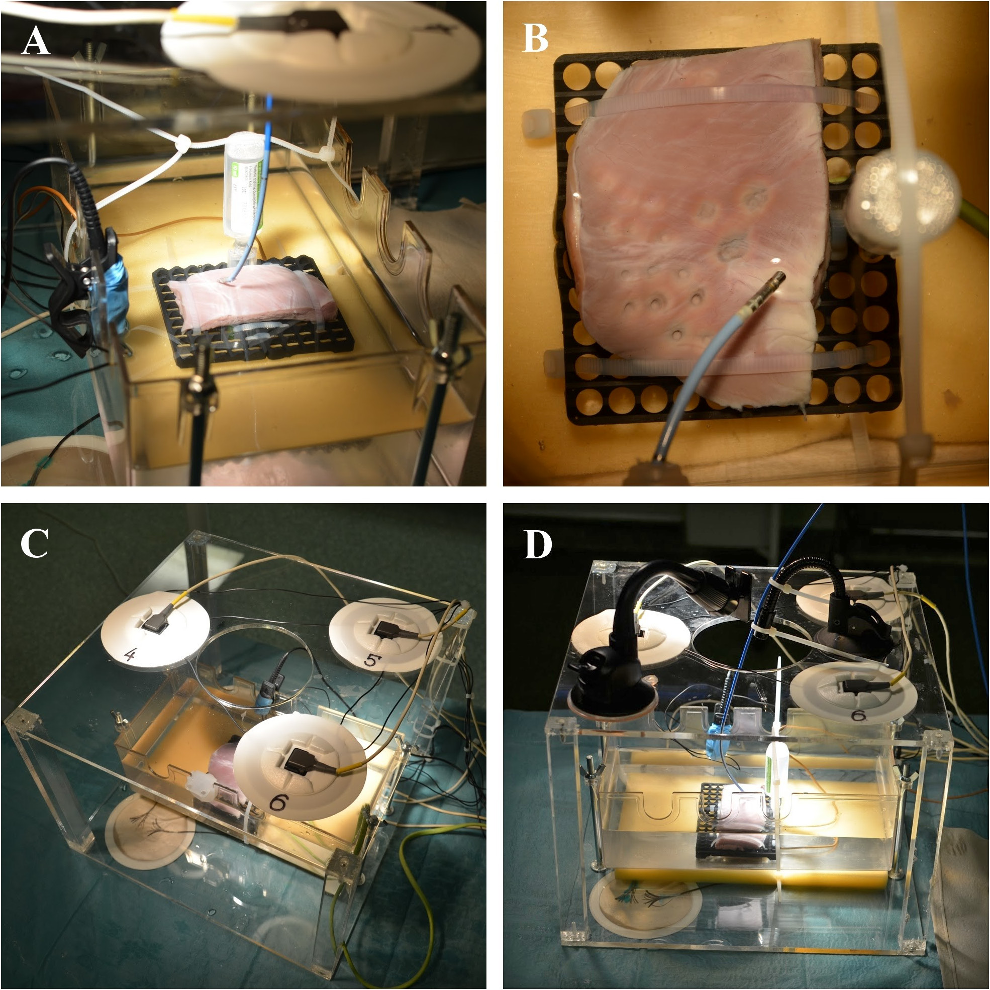 Before lesion formation, an electroanatomical model of porcine heart tissue specimen was prepared. The RFA was performed in a power-control mode with 2 different energy settings: 30 W and 35 W. These 2 power settings were selected as they were the most commonly used power settings in our centers (35 W was applied for RF applications in the ventricles, the right atrium and non-posterior wall application in the left atrium; 30 W was used in RF applications in the posterior wall of the left atrium). To allow efficient RFC delivery, catheters were irrigated at a flow rate recommended by the manufacturer depending on the ablation power settings: 20 mL/min for the power of 30 W and 30 mL/min for 35 W. Two different contact force levels were maintained, i.e., 20 ±5 g and 30 ±5 g. Continuous measurements of power, impedance and contact force were recorded for each RF ablation. The RFC delivery duration was limited to the steam pop occurrence. The time from the beginning of energy application to the steam pop occurrence, as well as the time to impedance fluctuations were recorded with the accuracy of 1 ms. Additionally, an impedance change was measured as the difference between the maximum impedance after the steam pop and the impedance just before this event. Having determined the power value and the time of application, energy delivered to the tissue was calculated following a standard equation (energy [J] = power [W] × time [s]). The temperature registered on the catheters just before steam pop was also recorded. After each steam pop occurrence, the ablation catheter was moved to another location where the new lesion was created.
