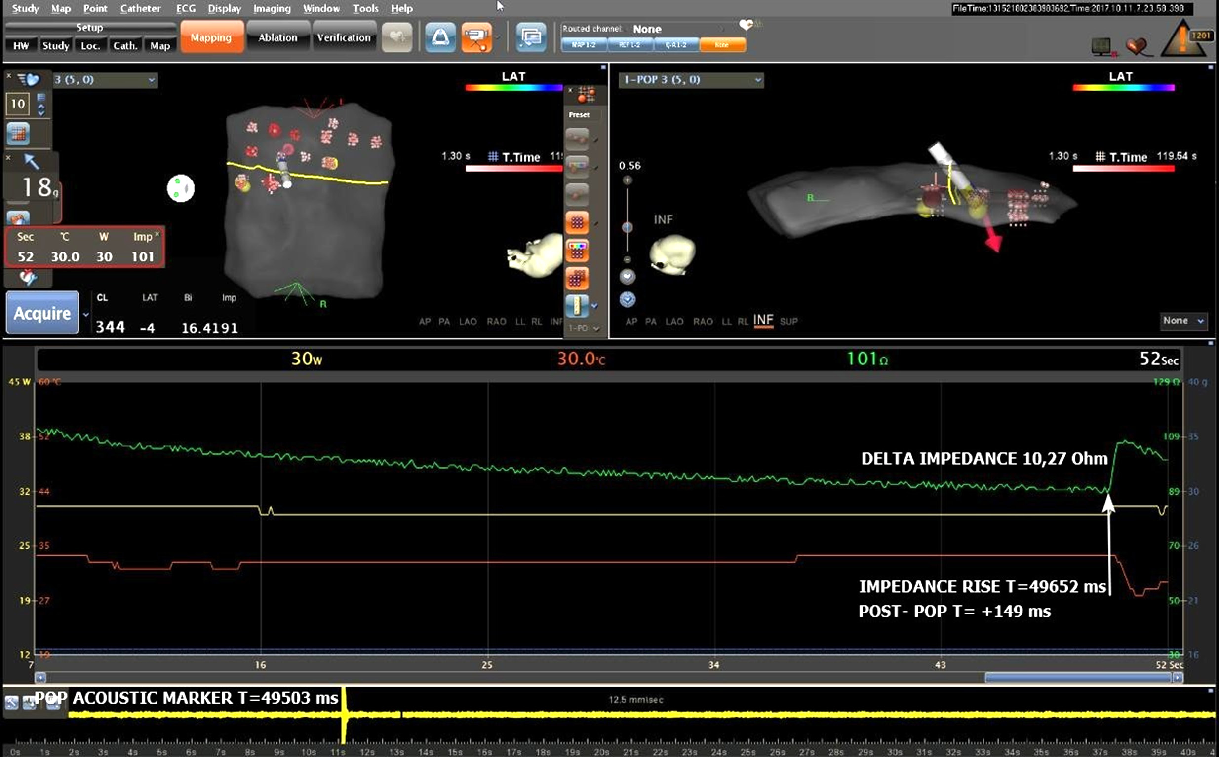 Radiofrequency ablation destroys myocardial tissue through thermal injury. Resistive heating occurs in a small zone adjacent to the catheter tip, while the surrounding myocardium is passively heated by conduction. Tissue temperatures above 50°C are necessary to produce irreversible coagulation necrosis. Steam pops result from excessive intramyocardial heating when the temperature exceeds 100°C. In such cases, steam is formed and trapped inside the myocardium. A violent tissue rupture occurs when the steam pressure destroys the structural integrity of the cardiac muscle.4, 5 Steam pops can lead, in the worst cases, to uncontrolled cardiac perforation and the clinical sequelae of cardiac tamponade.6 Steam pop incidence complicating up to 1.5% of RFA procedures has already been a subject of several studies.7, 8, 9, 10, 11, 12, 13, 14, 15, 16, 17, 18 Different parameters have been analyzed to predict the occurrence of steam explosions, including classical and novel tools.3, 5, 10, 19, 20, 21, 22, 23, 24, 25, 26, 27, 28, 29 An abrupt impedance rise is one of the most widely described physical phenomena accompanying RFA complicated by steam popping.3, 10, 12