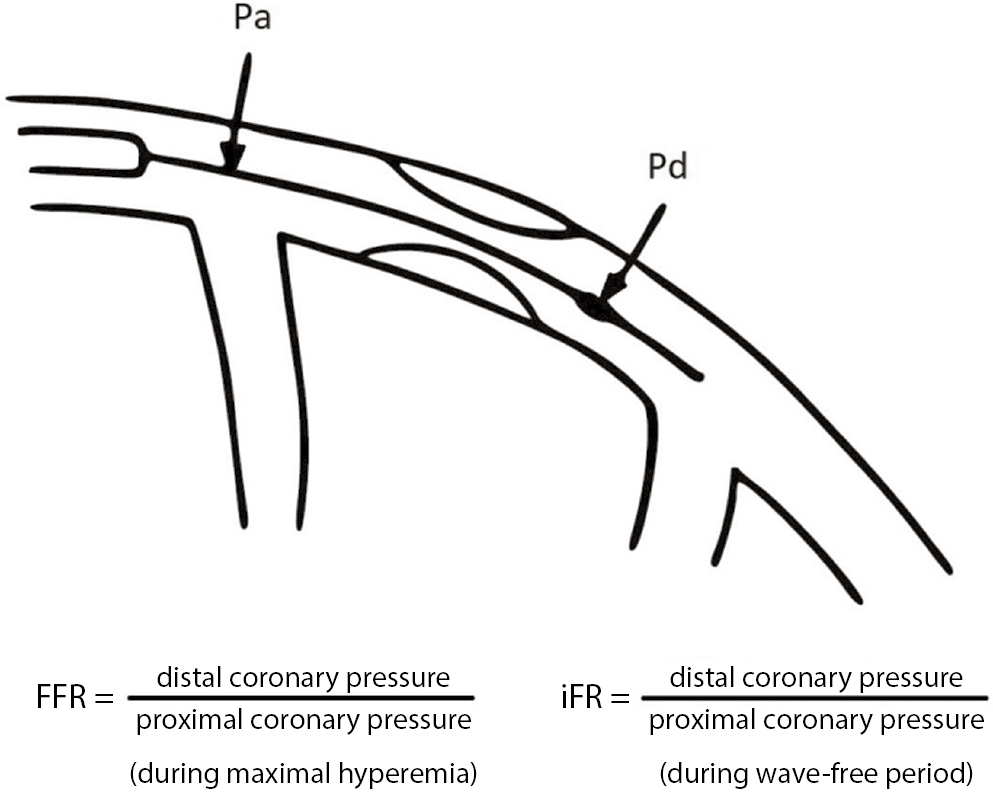 Instantaneous wave-free ratio (iFR) is assessed using the same pressure wire and calculated as the ratio of distal coronary pressure to the aortic pressure (Pd/Pa) (Figure 2). The primary difference between FFR and iFR is that iFR is performed during the isolated period of diastole – the wave-free period – while microvascular resistance is low and stable and does not affect coronary flow.11 The ADVISE-in-practice study reported the correlation between an iFR threshold of 0.9 and FFR threshold of 0.8.12 Meta-analysis of 2 trials, Functional Lesion Assessment of Intermediate Stenosis to Guide Revascularisation (DEFINE-FLAIR) and The Instantaneous Wave-Free Ratio versus Fractional Flow Reserve in Patients with Stable Angina Pectoris or Acute Coronary Syndrome (iFR-SWEDEHEART), reported that iFR-guided management was not inferior to FFR guidance in respect to death, myocardial infarction (MI) and unplanned revascularization.13