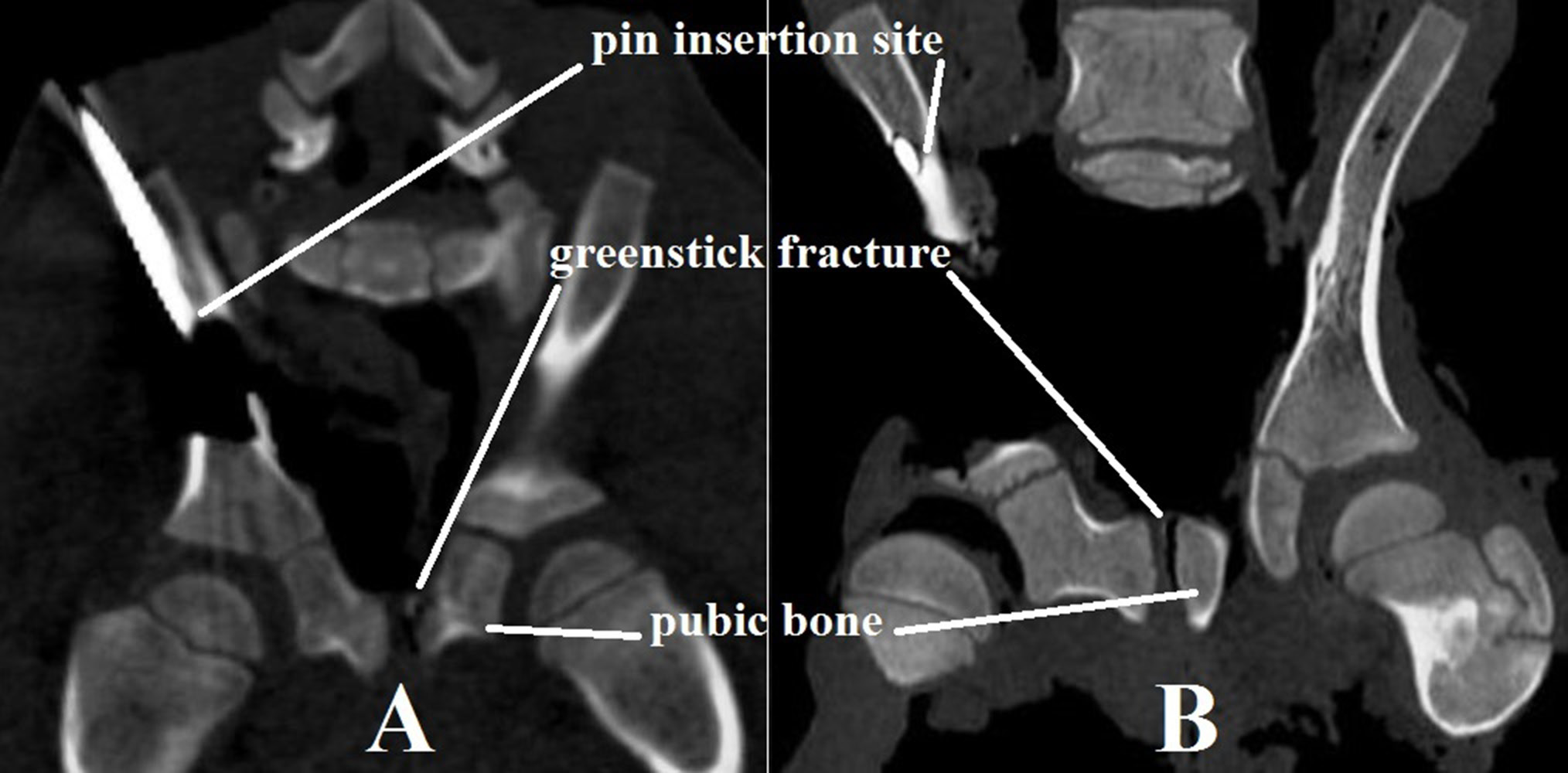 No bone changes were found after Salter pelvic osteotomy in three-week-old piglets. However, there was a metaphyseal contralateral pubic bone fracture in the symphysis pubis region in piglets aged 4 weeks and older (Figure 1). Extrapolating these data to humans, we can assume that the hinge point in younger patients will be located in the symphysis pubis cartilage, which is considered to be the “classic” hinge point described earlier. However, in older patients, this hinge point is likely to be located in the contralateral pubic bone metaphysis. This may be explained by the decrease in cartilage tissue amount in the pelvis and by the increase of pelvic bone and cartilage density with the patient’s age (which leads to transferring the load from the cartilaginous part of the symphysis pubis to the contralateral pubic bone metaphysis).