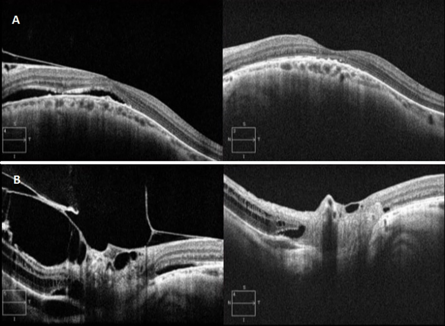 All patients showed postoperative improvement in visual acuity (Table 2). No decrease in IOP below 10 mm Hg was documented on postoperative day 1. Furthermore, no postoperative complications were recorded during the six-month follow-up, and evident improvement of the anatomical status was confirmed using OCT in all cases (Figure 1).