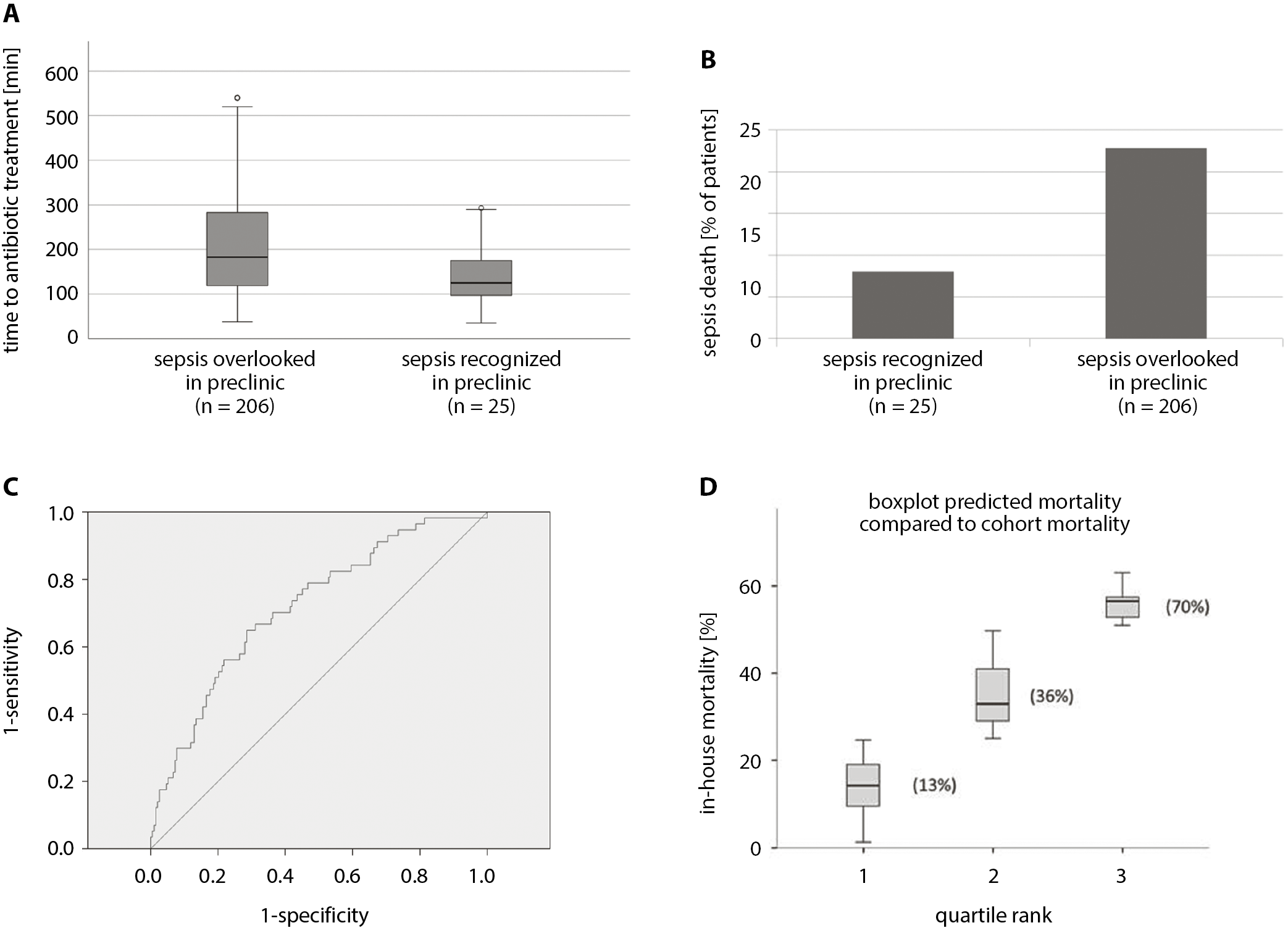 Results. Only 25 patients were correctly diagnosed by paramedics out-of-hospital. If sepsis was diagnosed, the median time to antibiotic administration was significantly lower (136.50 min compared to 206.98 min, p = 0.0069) and mortality was reduced from 22.8% to 8% (p = 0.0292). We have identified predictors for prognosis and calculated a predictive model with a modified quick Sepsis-related Organ Failure Assessment (qSOFA) score, which fits the needs for out-of-hospital usage and results in a better discrimination of vitally threatened patients (receiver operating characteristic (ROC) area under curve (AUC) of 0.641 compared to 0.719), as compared to the standard qSOFA.