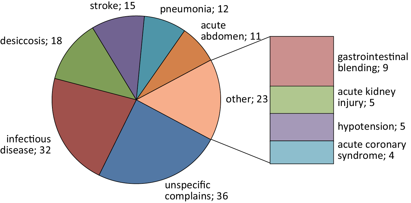 If sepsis was not suspected, several misleading diagnoses were documented by paramedics upon delivery to the emergency department (Figure 2). The most often diagnosis was “unspecific complaints,” followed by “unspecific infectious disease” and desiccosis (Table 3).
