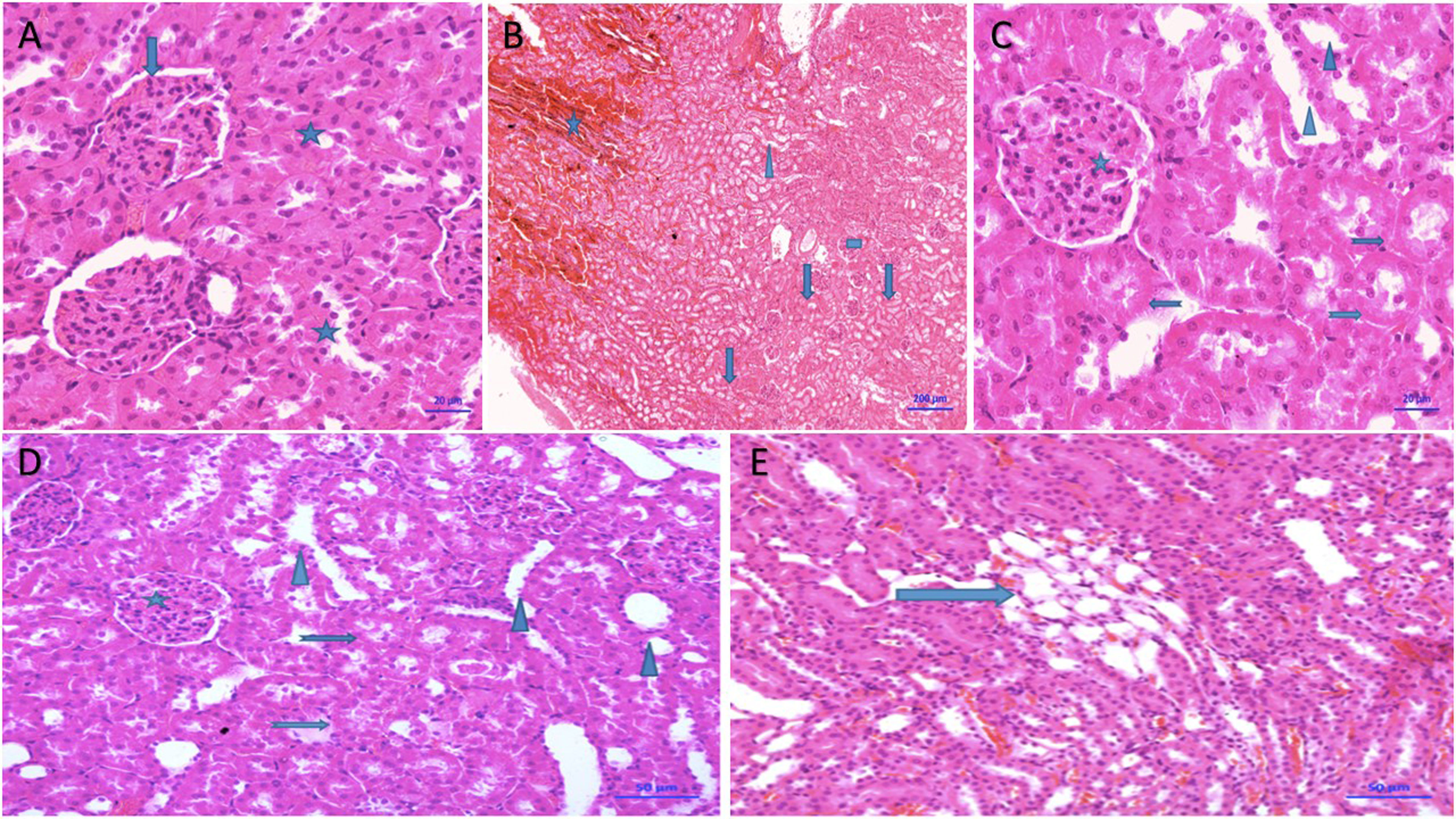 Renal tissues were fixed with 10% neutral buffered formalin for a period of at least 24 h. The tissues were then embedded in paraffin blocks and sliced horizontally using a microtome into 4-μm sections. A minimum of 3 sections were obtained from each sample and were stained with hematoxylin and eosin (H&E) for histomorphological assessment. The stained sections were assessed by an independent pathologist (who was blinded to the experimental treatments) using an AXIO LAB A1 Zeiss microscope (Carl Zeiss AG, Jena, Germany). The severity of the histopathological findings in each section was scored between 0 and 3. The assignment of the severity grades was as follows: 0 – normal tissue; 1 – mild damage; 2 – moderate damage; and 3 – severe damage.