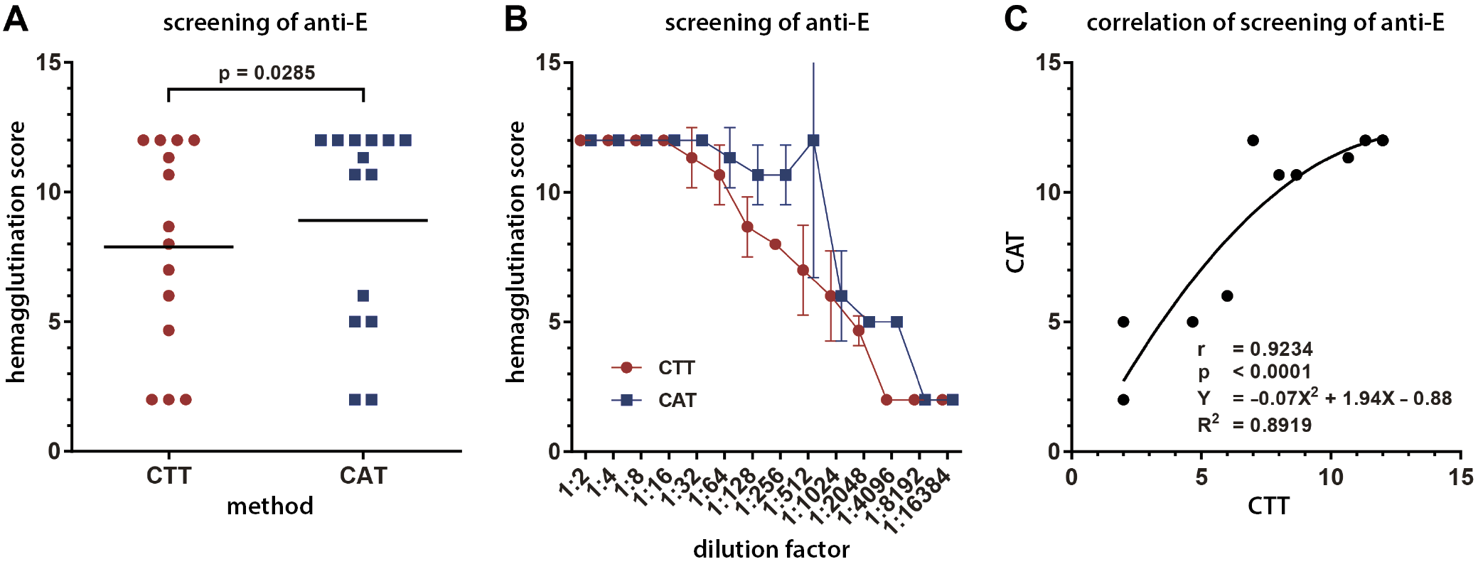 Differences in the screening of anti-D, anti-C and anti-E were observed, as CAT has a higher sensitivity than CTT. The screening of anti-D using CAT was significantly different from screening with CTT, with a p-value of 0.0078, a Spearman’s rank correlation coefficient of 0.8711 and a R-square of 0.8541 (Table 6, Figure 1C). The screening of anti-C using CAT was significantly different from screening with CTT, with a p-value of 0.0313, a Spearman’s rank correlation coefficient of 0.9988 and a R-square of 0.9913 (Table 6, Figure 2C). The screening of anti-E using CAT was significantly different from screening with CTT with a p-value of 0.0285, a Pearson’s correlation coefficient of 0.9234 and a R-square of 0.8919 (Table 6, Figure 3C).