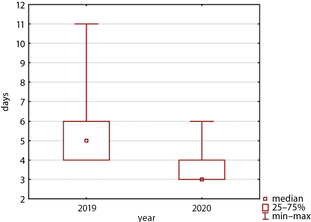 The mean duration of hospital stay for adults was approx. 2.5 days shorter in the 2nd evaluated period, which was statistically significant (Figure 1, p = 0.02737). The mean duration of hospital stay for children decreased in 2020 by 1.7 days compared to 2019. This difference was statistically significant (p = 0.0046).