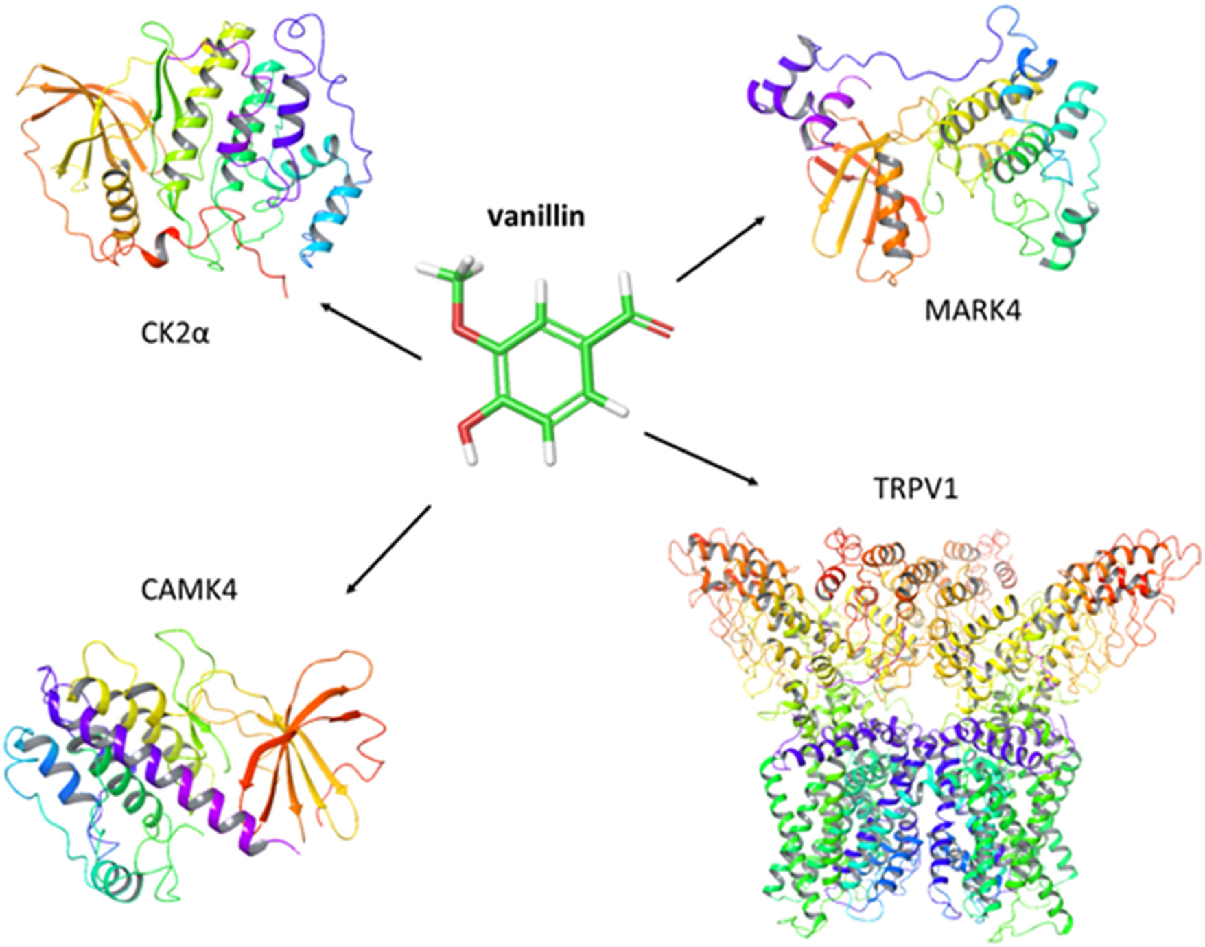 Vanillin may exert its antitumor potential by targeting membrane and intracellular receptors. The current literature suggests that this compound acts on 4 main proteins (transmembrane channel TRPV1) and 3 cytoplasmic peptides – MARK4, CAMK4 and CK2 (Figure 1).