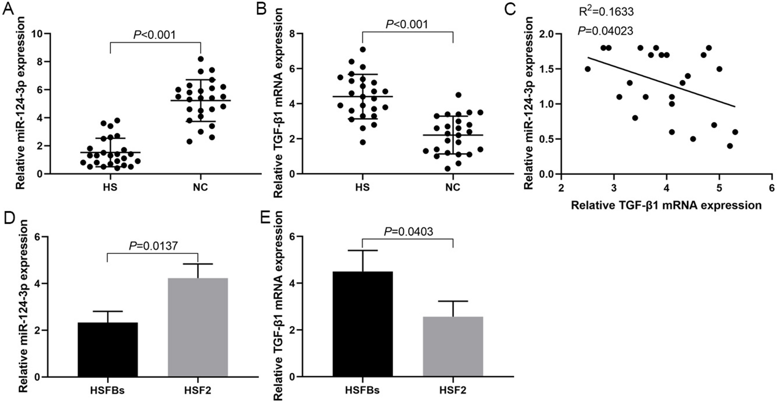 The RT-PCR results showed that the expression levels of miR-124-3p in HS tissues were significantly lower than that in NC tissue (Figure 1A), while the expression levels of TGF-β1 mRNA in HS tissues were significantly higher than in NC tissue (Figure 1B), and there was a negative correlation between them (Figure 1C). The miR-124-3p expression in HSFBs was significantly lower than in HSF2 cells (Figure 1D), while TGF-β1 mRNA expression in HSFBs was significantly higher than in HSF2 (Figure 1E).