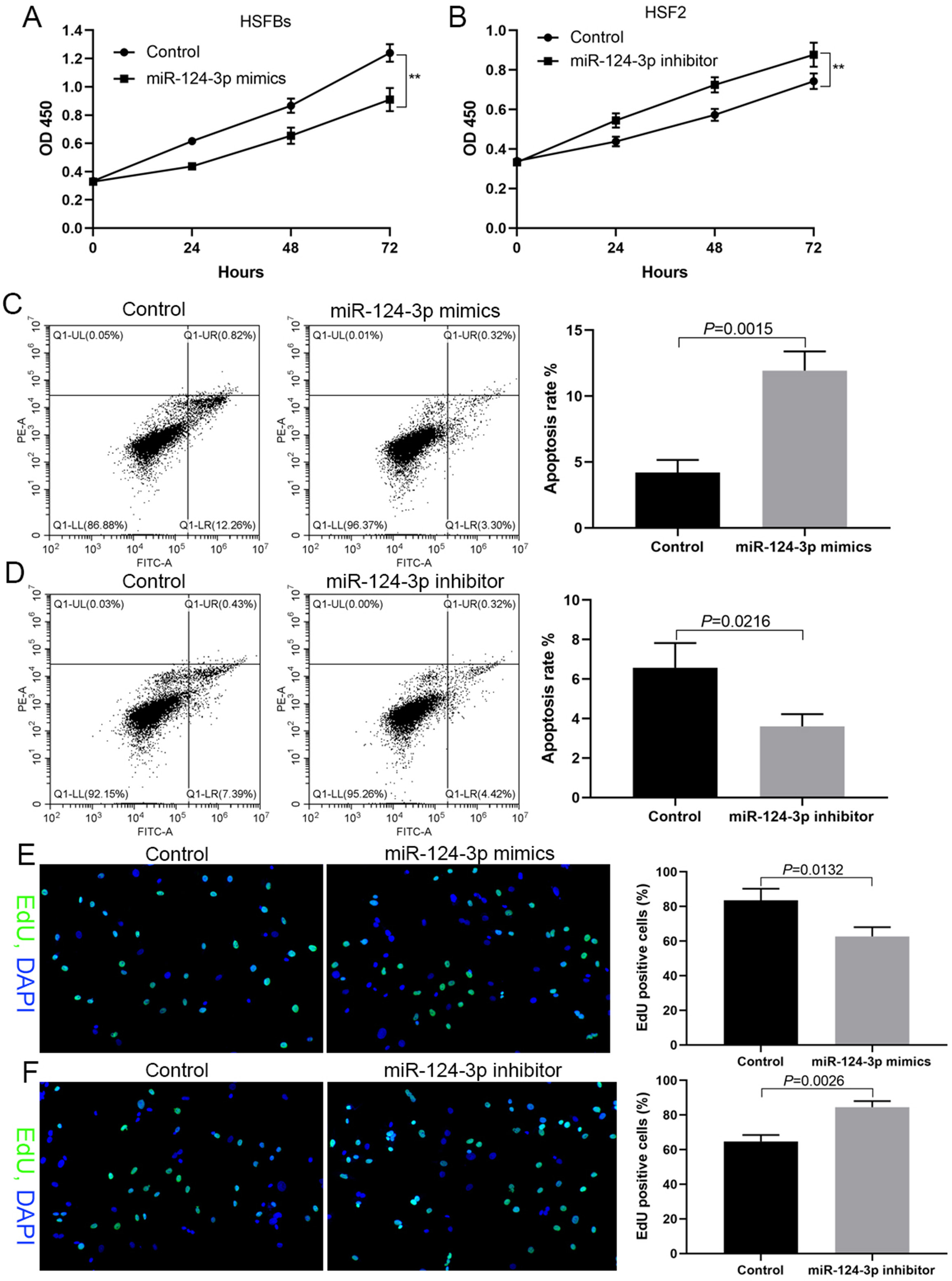 In HSFBs with low expression of miR-124-3p, DNA synthesis, cell proliferation and cell survival significantly decreased after being transfected with miR-124-3p mimics (Figure 2A,C,E). However, in HSF2 cells with high expression of miR-124-3p, DNA synthesis, cell proliferation and cell survival significantly increased after transfection transfected with a miR-124-3p inhibitor (Figure 2B,D,F).