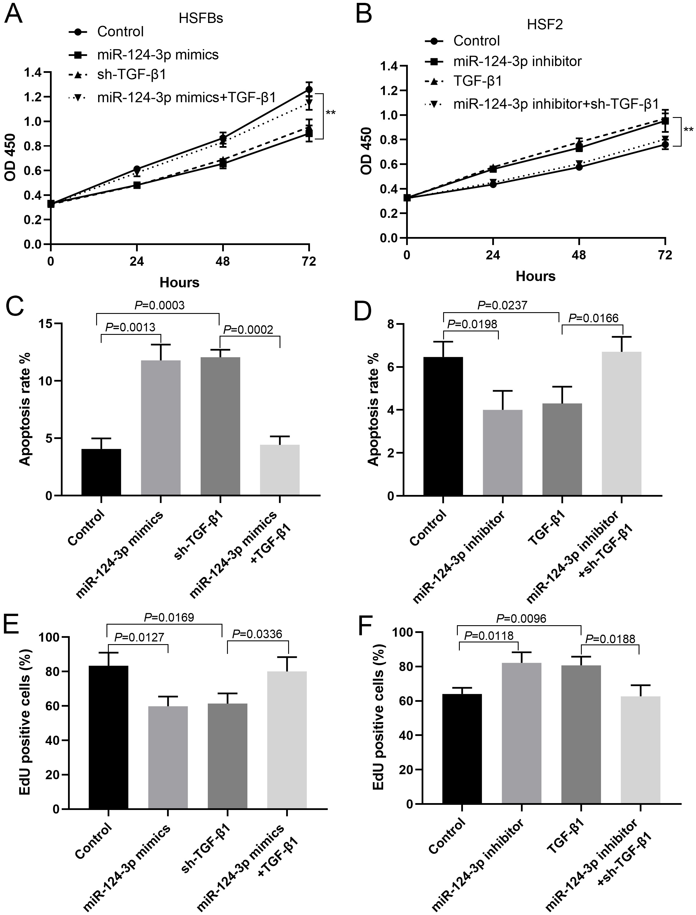 In HSFBs transfected with miR-124-3p mimics or shRNA against TGF-β1, cell proliferation was inhibited, while in HSFBs co-transfected with miR-124-3p mimics and TGF-β1, cell proliferation was restored (Figure 4A,C,E). In HSF2 transfected with miR-124-3p inhibitor or TGF-β1, cell proliferation was promoted, while in HSF2 co-transfected with miR-124-3p inhibitor and TGF-β1 shRNA, cell proliferation was inhibited (Figure 4B,D,F).