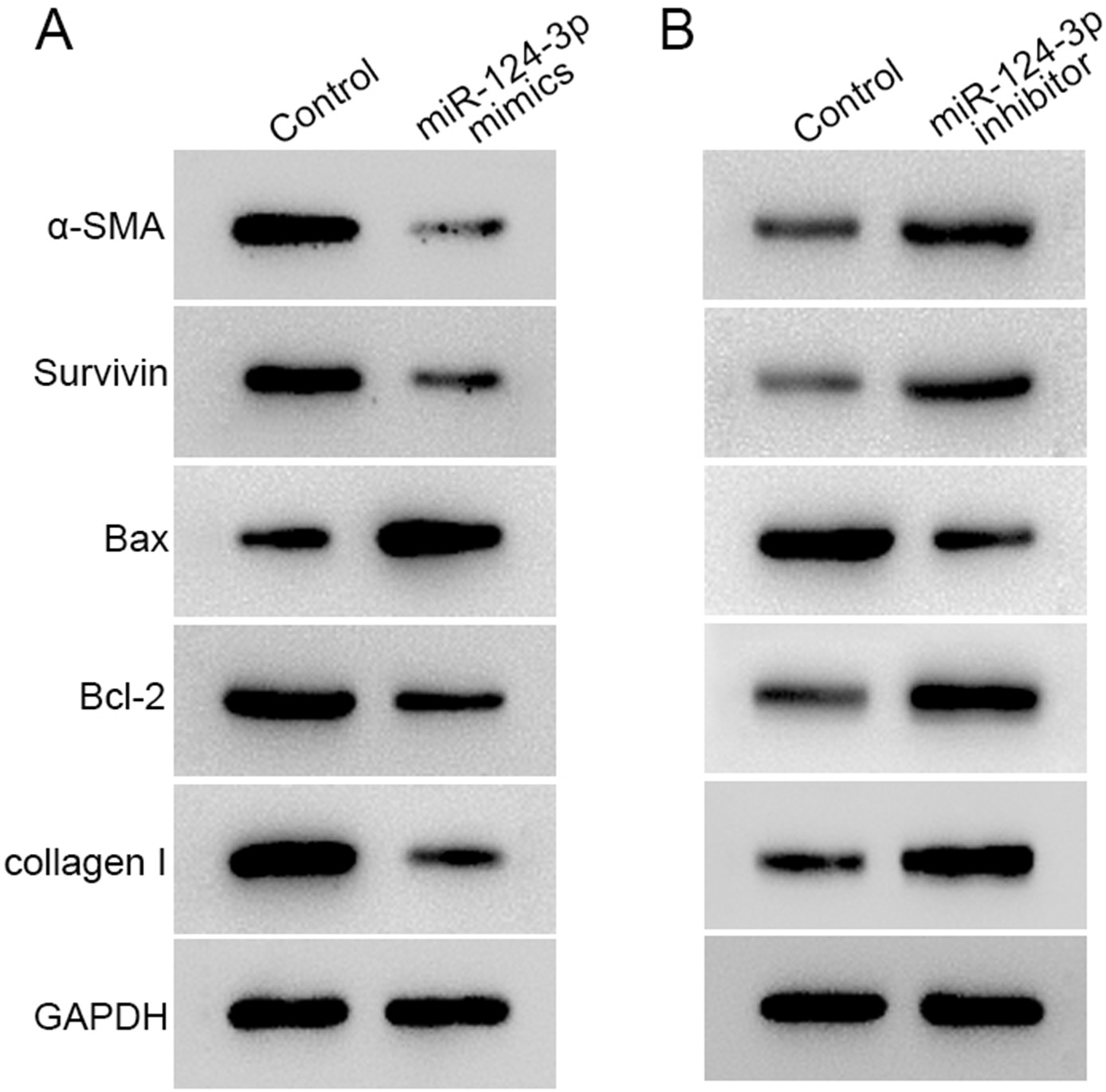 The expression of α-SMA, collagen I, survivin, and Bcl-2 was inhibited, and Bax expression increased after transfection of miR-124-3p mimics into HSFBs (Figure 5A). However, the expression of α-SMA, collagen I, survivin, and Bcl-2 was promoted, and Bax expression was inhibited with a miR-124-3p inhibitor (Figure 5B).