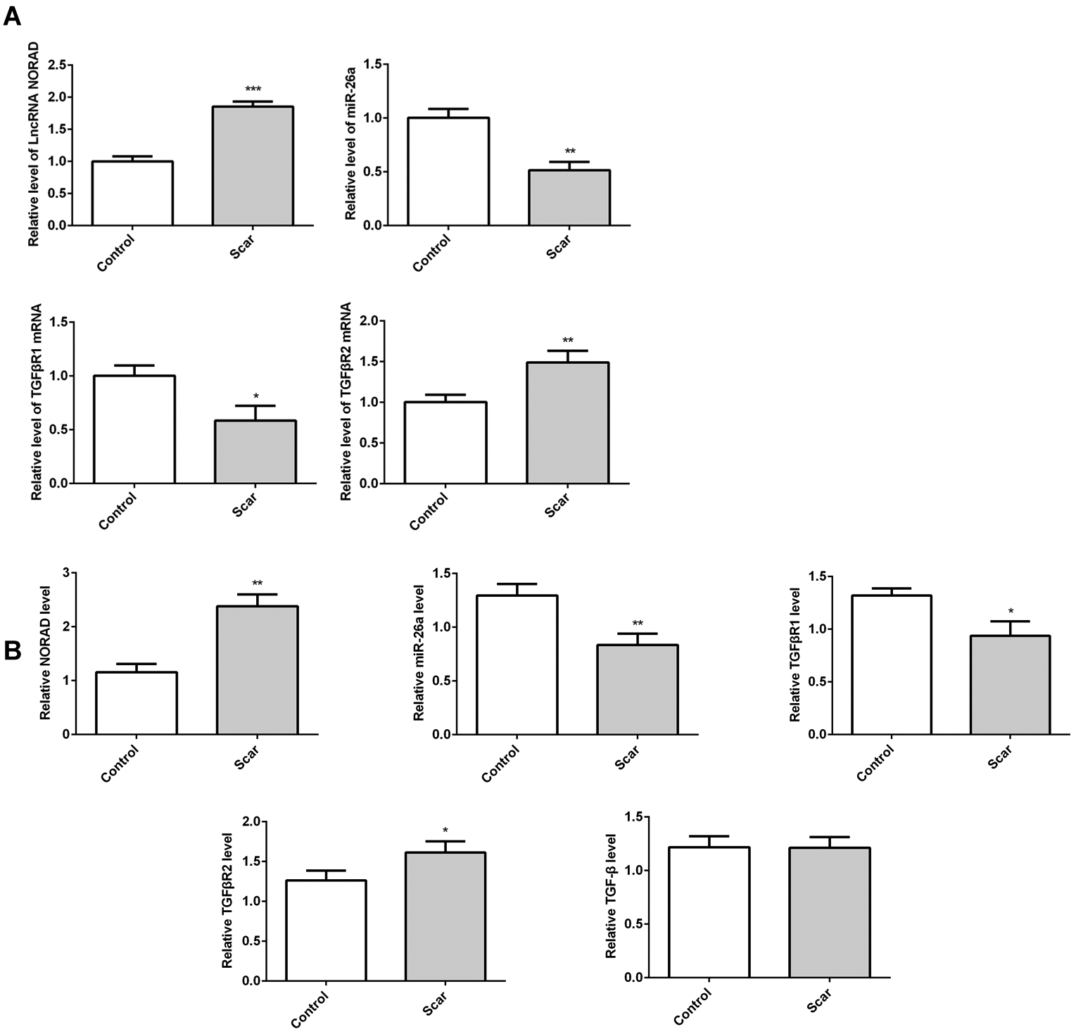 The qPCR results showed that LncRNA NORAD was significantly upregulated and miR-26a was downregulated in intermediate scar tissues compared to adjacent normal tissues. TGF-βR2 levels were increased, as demonstrated by qPCR and ELISA (Figure 1A,B). However, TGF-βR1 levels were reduced. TGF-β showed no significant change in the HTS group compared to the control group.