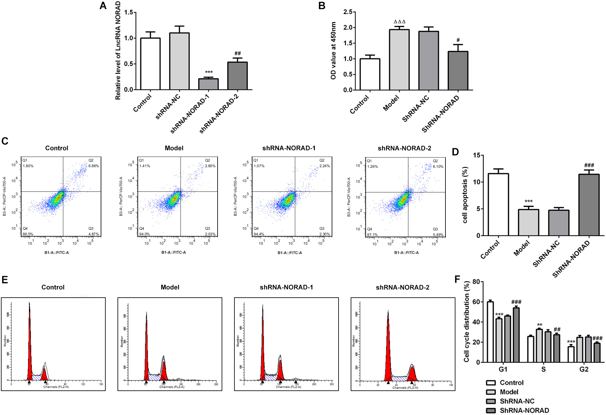 TGF-β1 was used to induce HSF proliferation, and qPCR was used to evaluate the transfection efficacy of shRNA-NORAD-1 or shRNA-NORAD-2. The results showed that shRNA-NORAD-1 has a greater inhibitory effect on NORAD expression than shRNA-NORAD-2 (Figure 2A). Thus, shRNA-NORAD-1 was used in all further experiments. Additionally, the CCK-8 assay demonstrated that cell proliferation ability was markedly decreased by silencing LncRNA NORAD (Figure 2B). Silencing LncRNA NORAD promotes cell apoptosis, as shown by comparing to results from the ShRNA-NC group (Figure 2C,D).