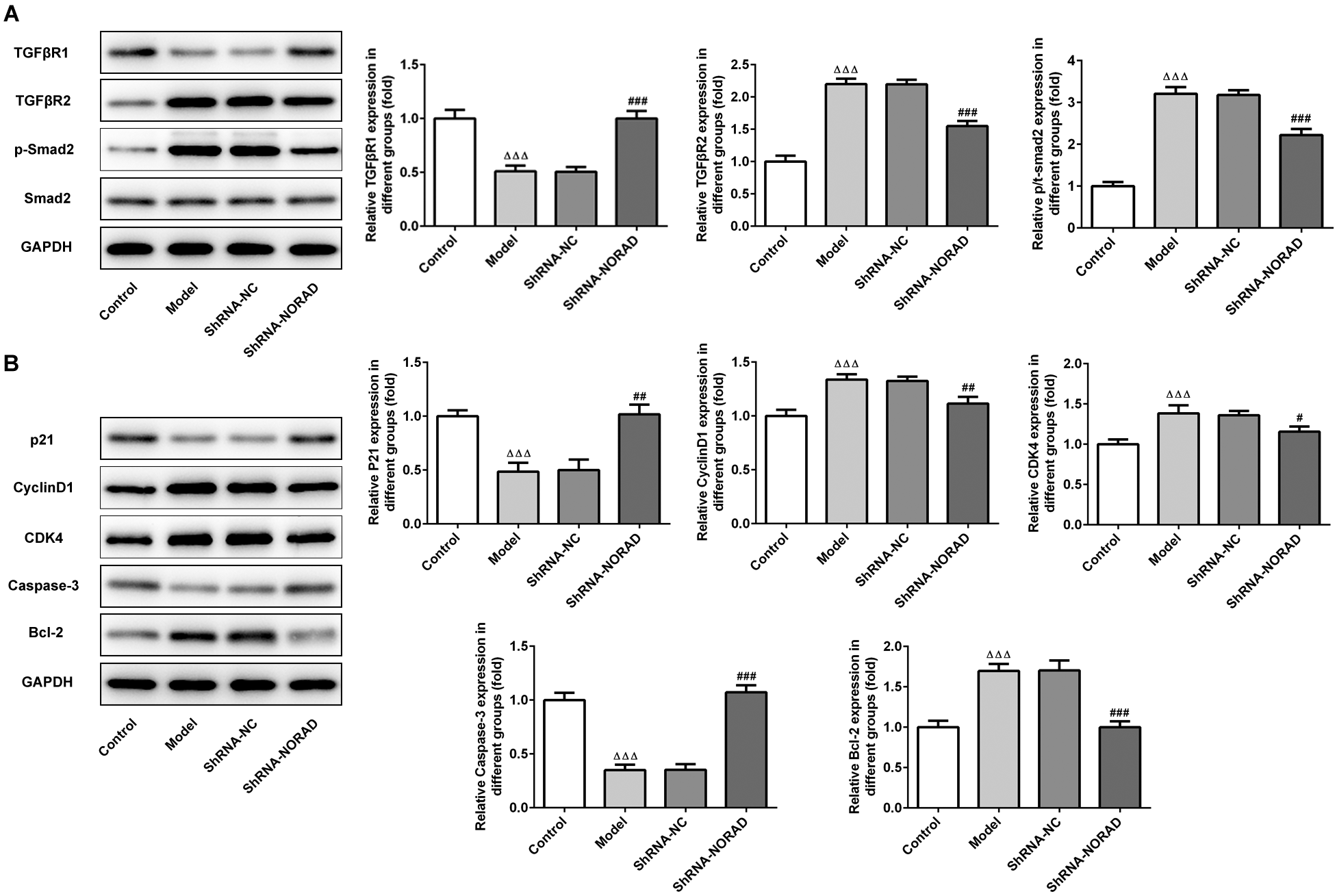 The results of flow cytometry revealed that decreasing endogenous LncRNA NORAD significantly increased the proportion of cells in G0/G1 phase compared with the control group. Simultaneously, the proportion of cells in S and G2/M phase was reduced (Figure 2E,F). These results imply that LncRNA NORAD affects the G1 arrest of HSFs treated with TGF-β1. That is to say, G1 arrest is significantly promoted by a decrease in endogenous LncRNA NORAD expression (Figure 2E,F). TGF-βR1 levels were significantly increased, while TGF-βR2 and p-Smad2 were markedly decreased (Figure 3A). These results suggest that decreasing endogenous LncRNA NORAD levels may suppress the TGF-β pathway. Proteins regulating cell cycle and cell apoptosis-related proteins were also significantly affected (Figure 3B). The above findings indicate that LncRNA NORAD knockdown promotes G1 arrest by regulating p21/cyclin D1/CDK4, and by modulating the apoptosis pathway by increasing pro-apoptosis protein caspase-3 and decreasing anti-apoptosis protein Bcl-2.