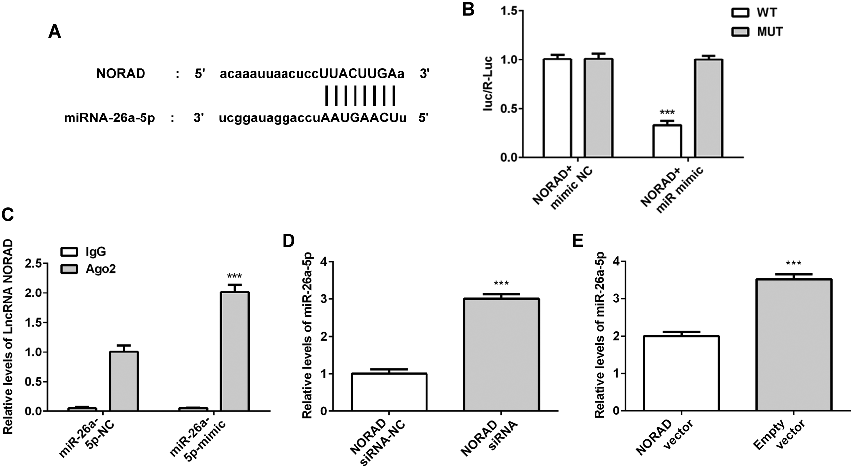 The Starbase database (http://starbase.sysu.edu.cn/) predicts that miR-26a could target LncRNA NORAD (Figure 4A). Therefore, a cell experiment was performed to investigate whether miR-26a could bind to LncRNA NORAD, and whether LncRNA NORAD could act as a sponge of miR-26a and regulate its biological function. The sequence of LncRNA NORAD was inserted downstream of a luciferase gene to establish wt-NORAD plasmids. In HSF cells co-transfected with wt-NORAD and a miR-26a mimic, luciferase activity was significantly decreased compared to the mut-NORAD and miR-26a treatment groups, suggesting an interaction between miR-26a and NORAD (Figure 4B). Also, the RIP assay showed the LncRNA NORAD level in the miR-26a mimic group was significantly higher than that of the miR-26a-NC group when anti-Ago2 antibody was used to treat the supernatant (Figure 4C). In addition, LncRNA NORAD markedly affects miR-26a level (Figure 4D,E). Thus, LncRNA NORAD functions as a sponge of miR-26a to inhibit miR-26a expression.