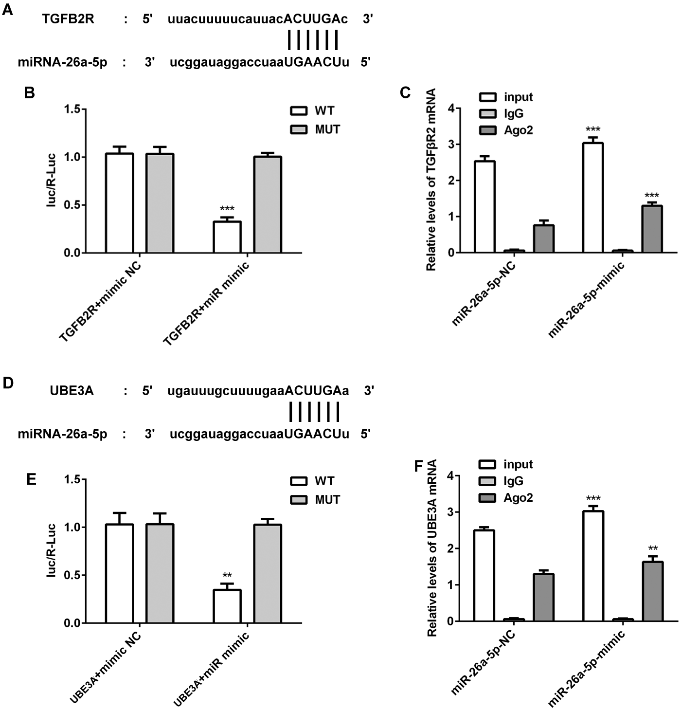 We analyzed whether miRNA-26a targets the TGF-β pathway. Starbase predicts that miR-26a could bind to the 3’UTRs of TGF-β2 and UBE3A (Figure 5A,D). The luciferase reporter assay revealed miR-26a can bind to the 3’UTR of either TGFR2 or UBE3A, as it reduces the luciferase activity of both wt-TGFR2 and UBE3A (Figure 5B,E). The RIP assay demonstrated that TGF-βR2 and UBE3A levels in the miR-26a mimic group were distinctly higher than in the miR-26a-NC group when anti-Ago2 antibody was added to the supernatant (Figure 5C,F). These data imply that miRNA-26a post-transcriptionally regulates TGF-βR2 and UBE3A.