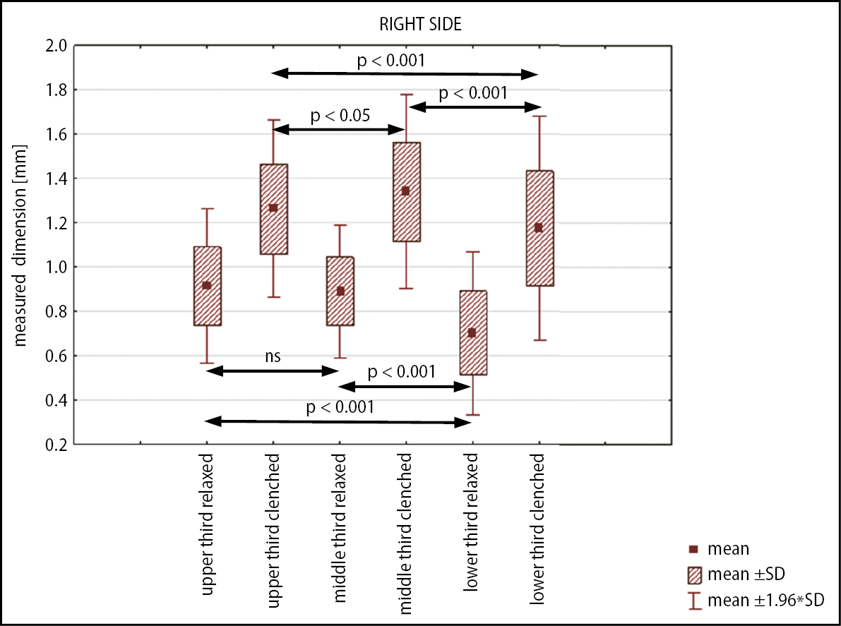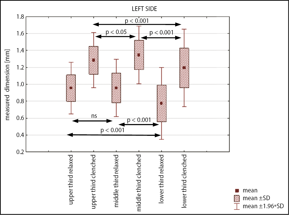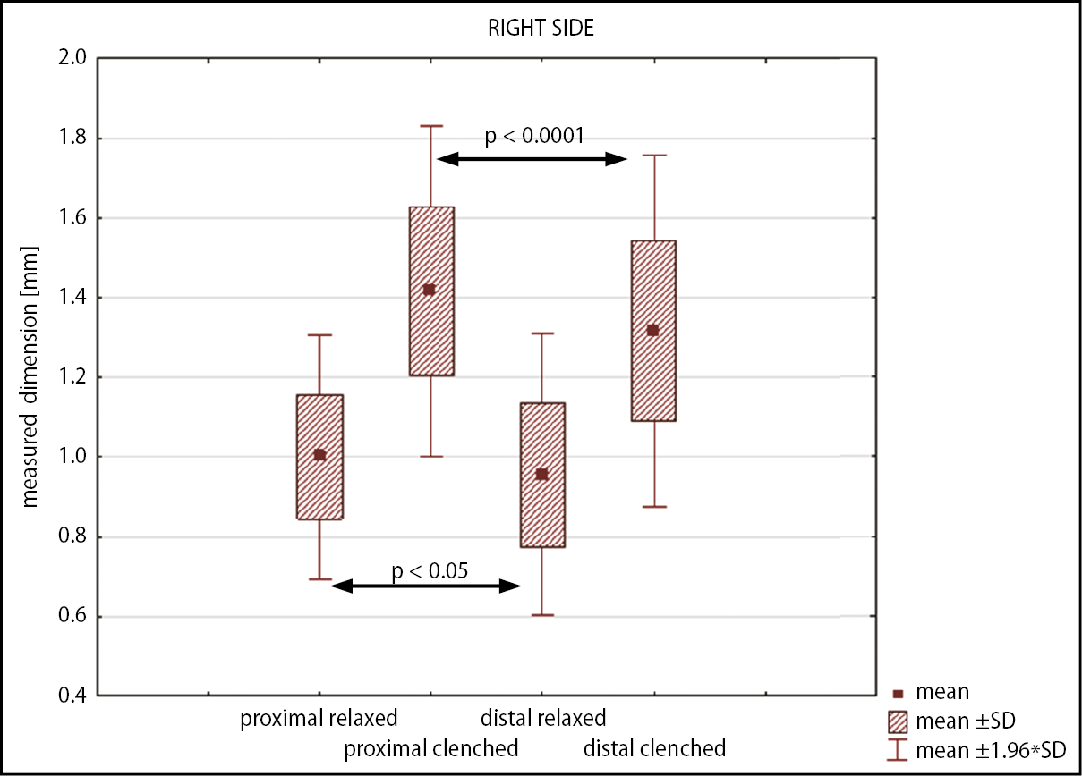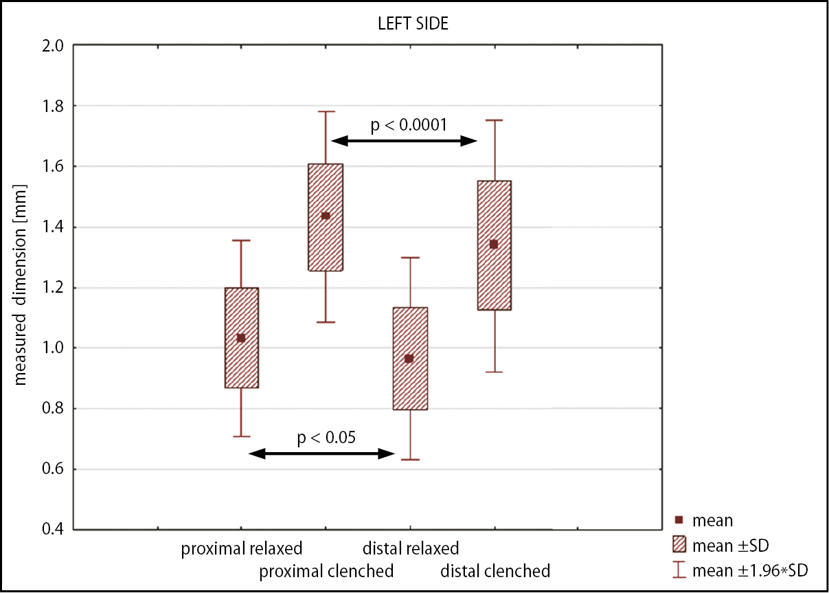 The data obtained from every examined area were compared to other areas in the coronal and axial projections. The Friedman’s test (axial projection) and Wilcoxon’s test (coronal projection) showed statistically significant differences between most of the analyzed areas. No statistically significant differences were found between masseter muscle thickness measured in the upper and middle areas during relaxation. No statistically significant differences were found between left and right sides or between males and females (p > 0.05). Expected morphological differences were found at ultrasound records. Clinically, the minimum mean masseter muscle thickness was recorded in the lower third of the muscle at rest (0.74 ±0.2 mm) and the maximum mean in the proximal part of contracted muscle (1.42 ±0.2 mm). The recorded masseter muscle thickness measurements are presented in Table 1.