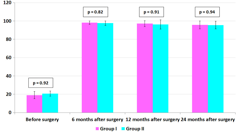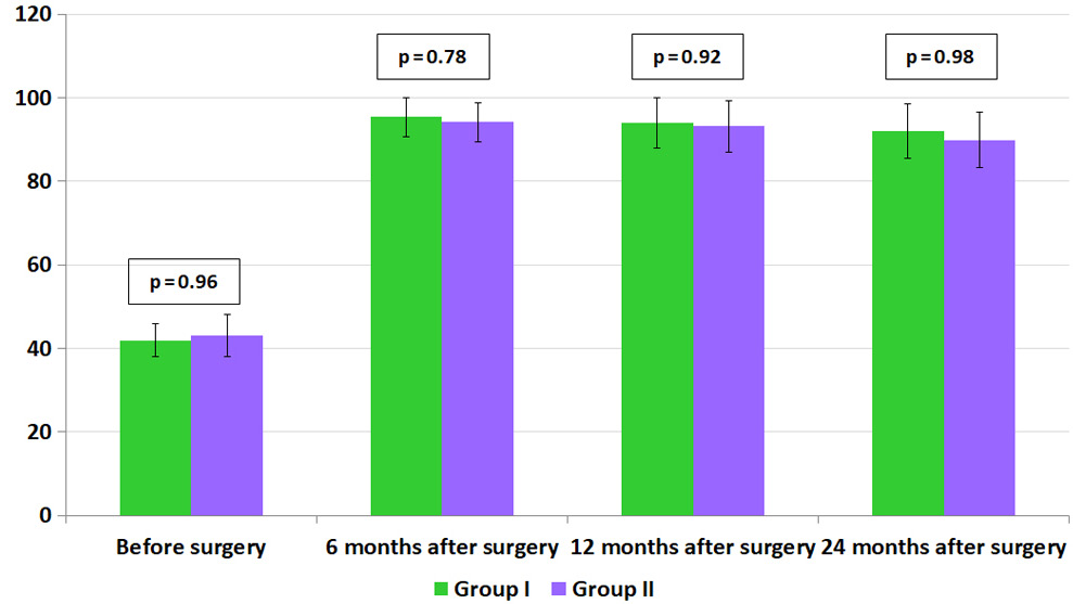 In group I, prior to surgery, the ROM of the active knee flexion in the operated limb (x = 111.32 ±8.32°) was significantly lower (p ≤ 0.001) than that in the non-operated limb (x = 129.19 ±5.81°), as well as at 6 months (p ≤ 0.001) and 12 months (p ≤ 0.001) following reconstruction. The ROM in the 24th month after reconstruction was lower than in the non-operated limb, but not significantly (p = 0.061), and such a miniscule difference in obtained values should not be of clinical significance (Table 1).